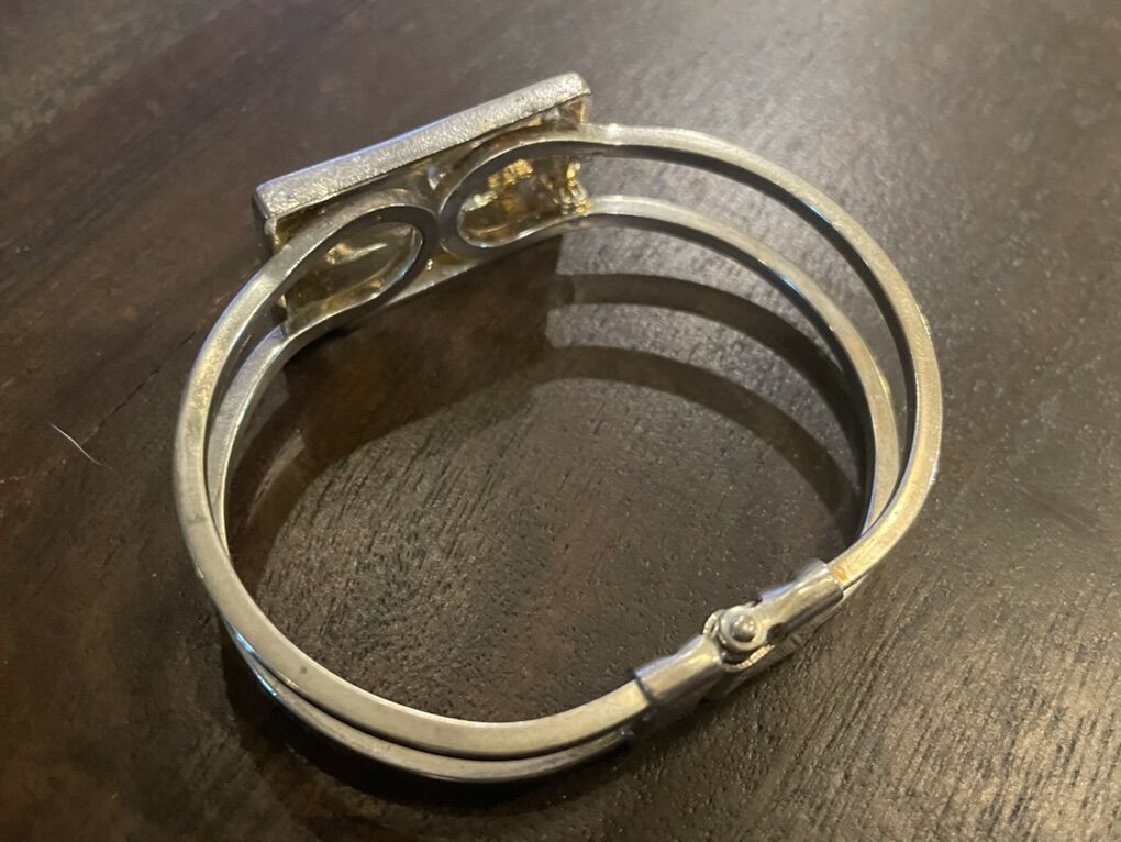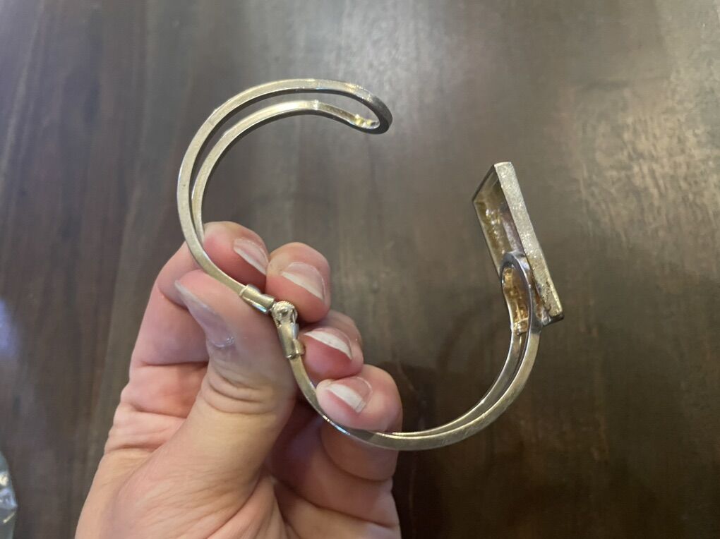 I have a beautiful silver tone bracelet with a light blue rectangle inlaid stone. It has a hinge to open it to put it on. I don’t see any maker’s marks or metal content markings so I don’t know what the metal actually is. The stone is very smooth without veining so I assume it is fake. See my other ads for jewelry, artwork, home decor and more.