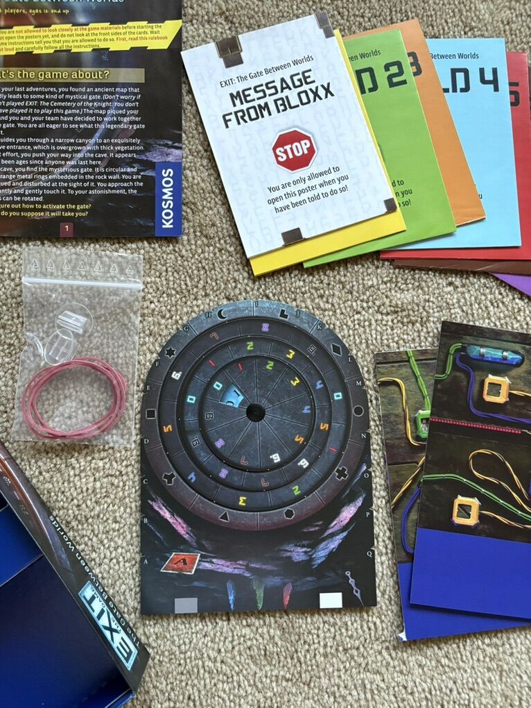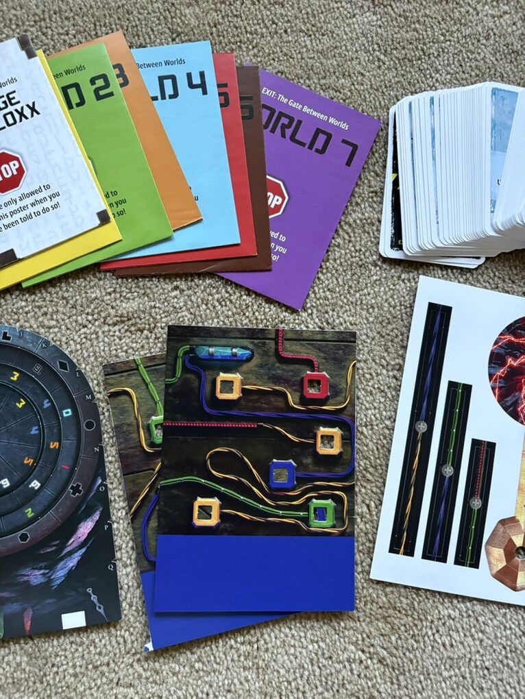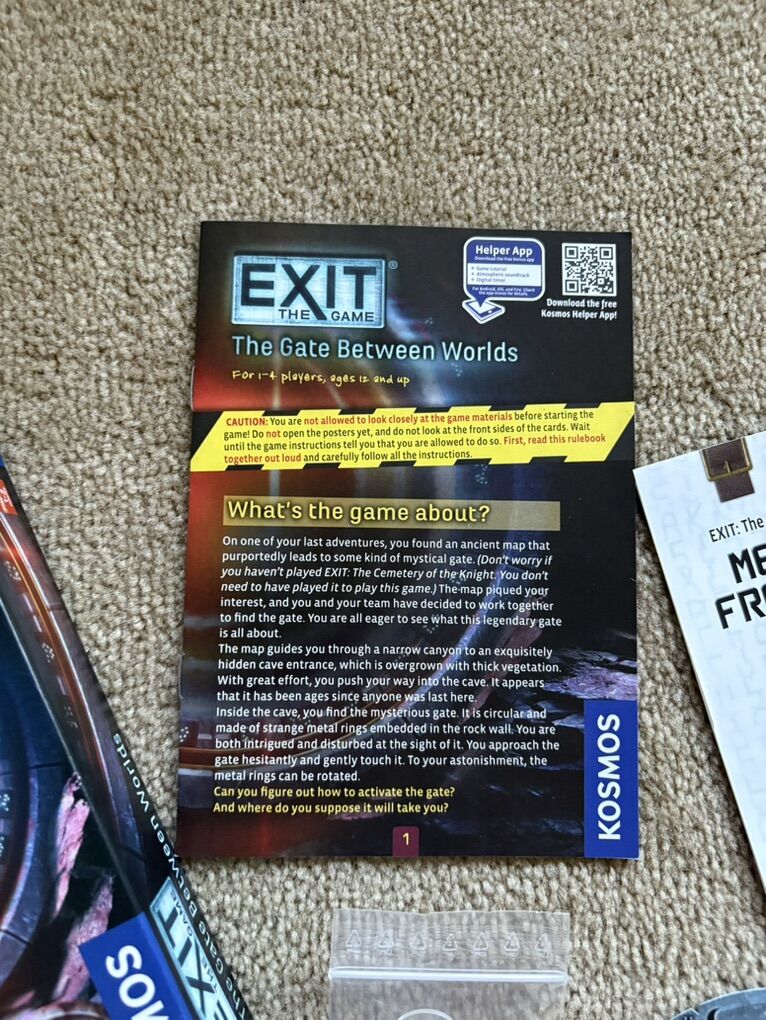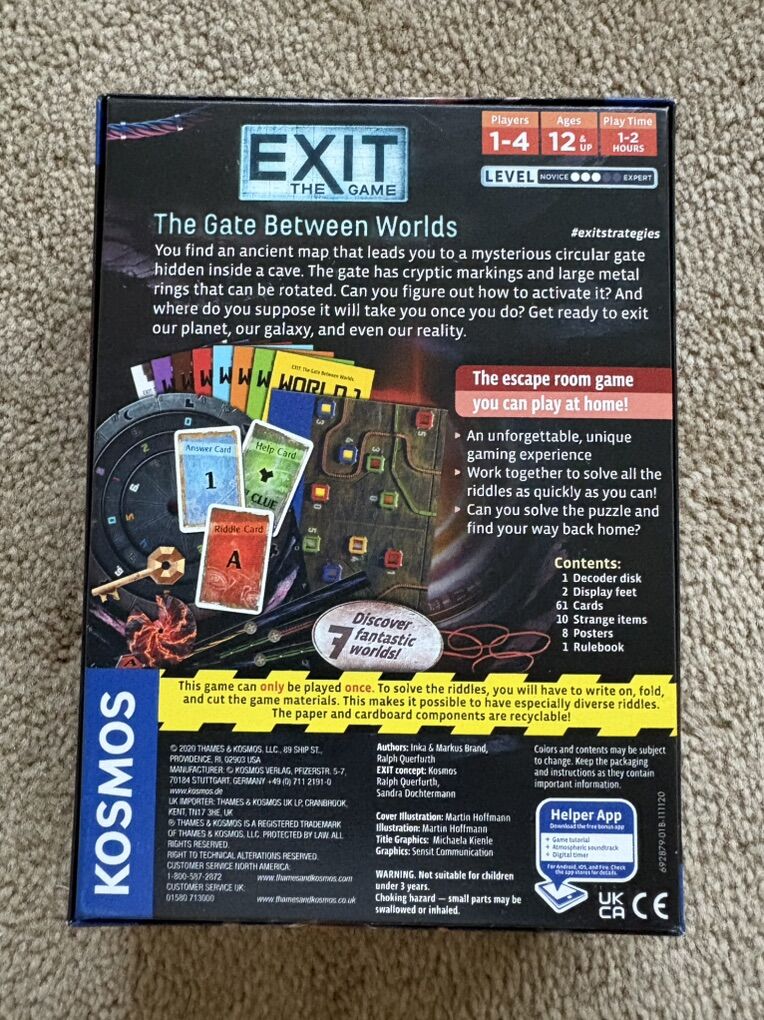 COMPLETE EXIT: The Game--The Gate Between Worlds. Can you solve the riddles and find your way back home? An escape game. By Kosmos, Inka & Markus Brand, Ralph Querfurth, 2020. 1-4 players, age 12+. Complete, no missing pieces. Excellent condition, some components unpunched. Text only. Cash or Venmo.