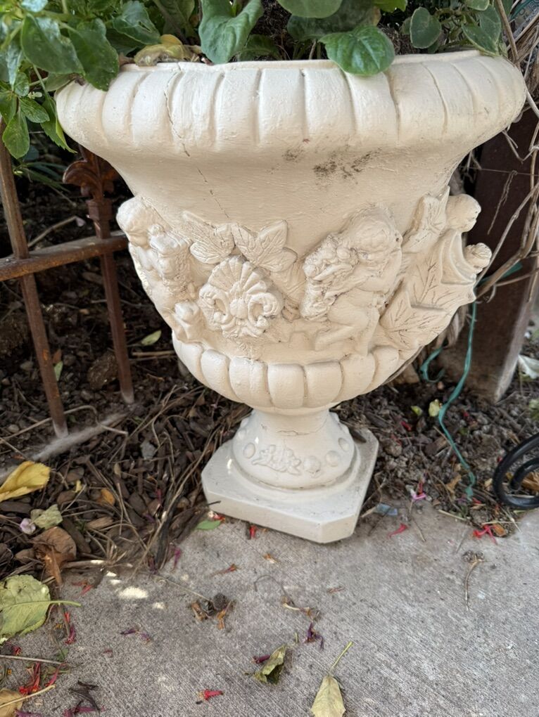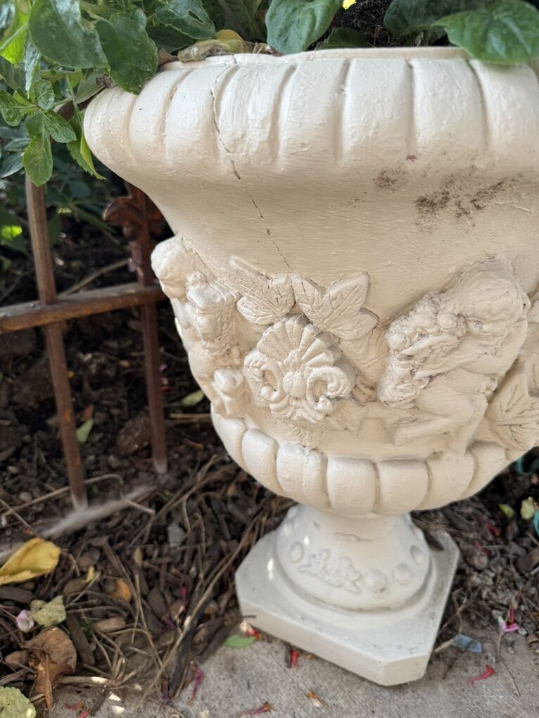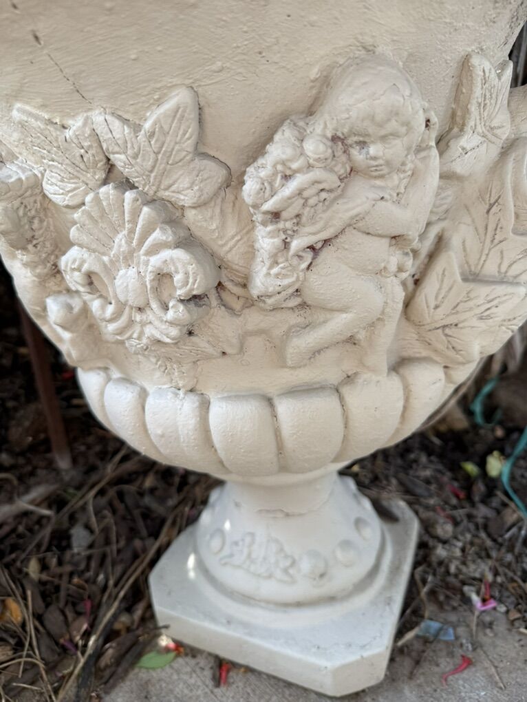 Vintage Concrete Angel Planter 20 T does have some cracks.