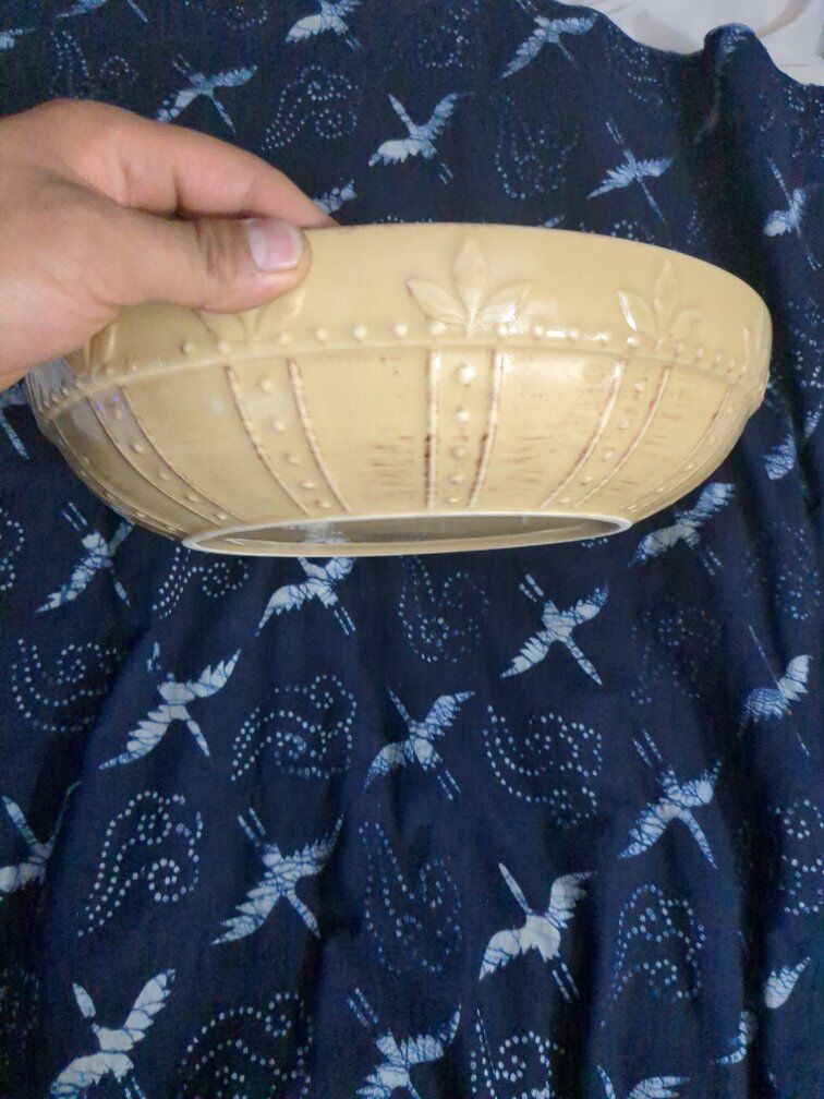 VenmoSorrento tan Debby Segura serving bowl from Signature housewares incorporated. That measures 11 5/8" in diameter. $10