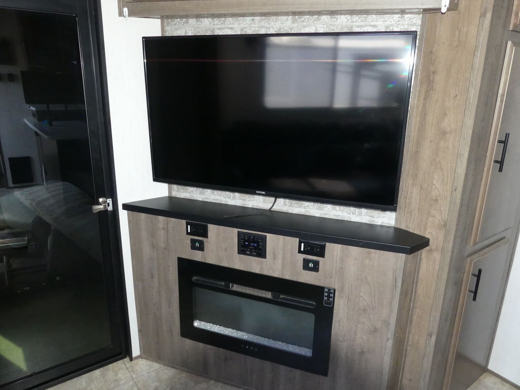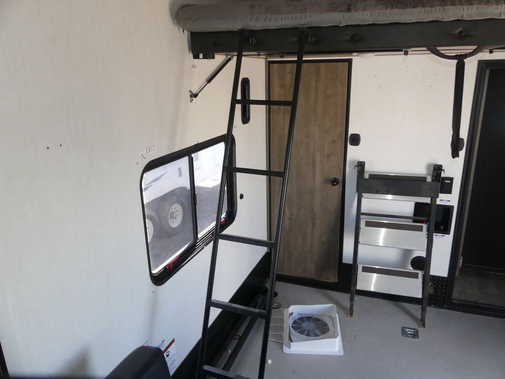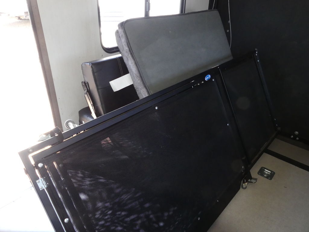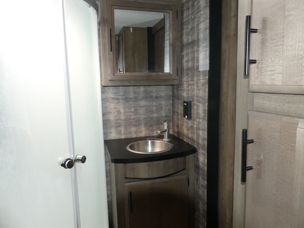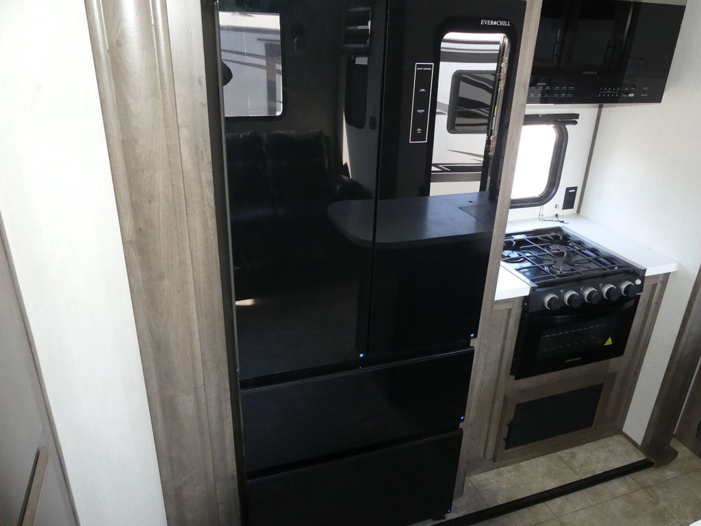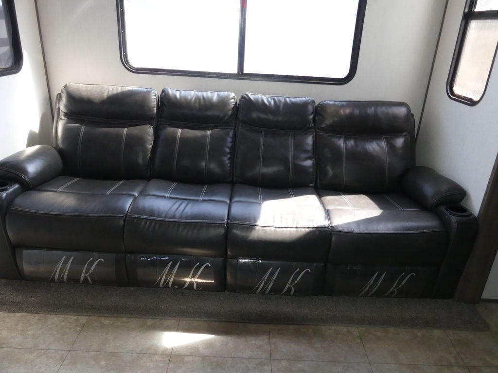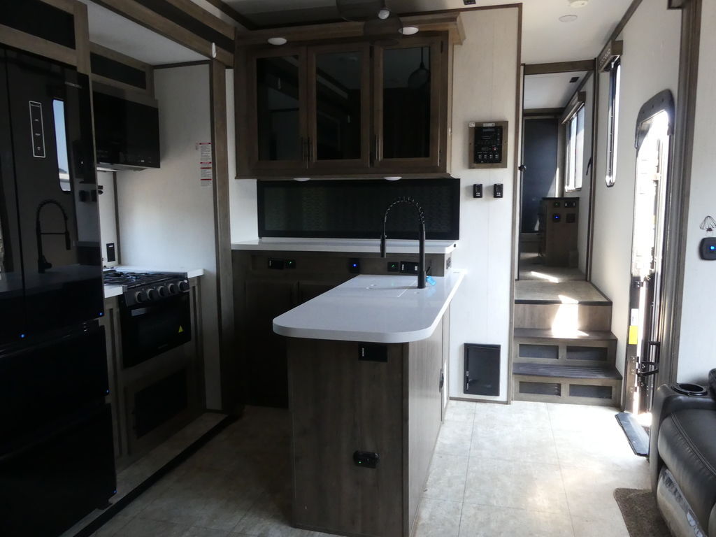 Luxury abounds in this stunning toy hauler! The kitchen features residential appliances, solid surface counter tops, stainless steel sink with pull-down sprayer, and ample storage. The high ceilings and extra tall main slideout really expand the already large space. The bathroom features a large glass shower, porcelain bowl foot flush toilet and linen closet. The bedroom features a power adjustable king bed, large dresser, front wardrobe, dedicated air conditioning and plenty of storage.