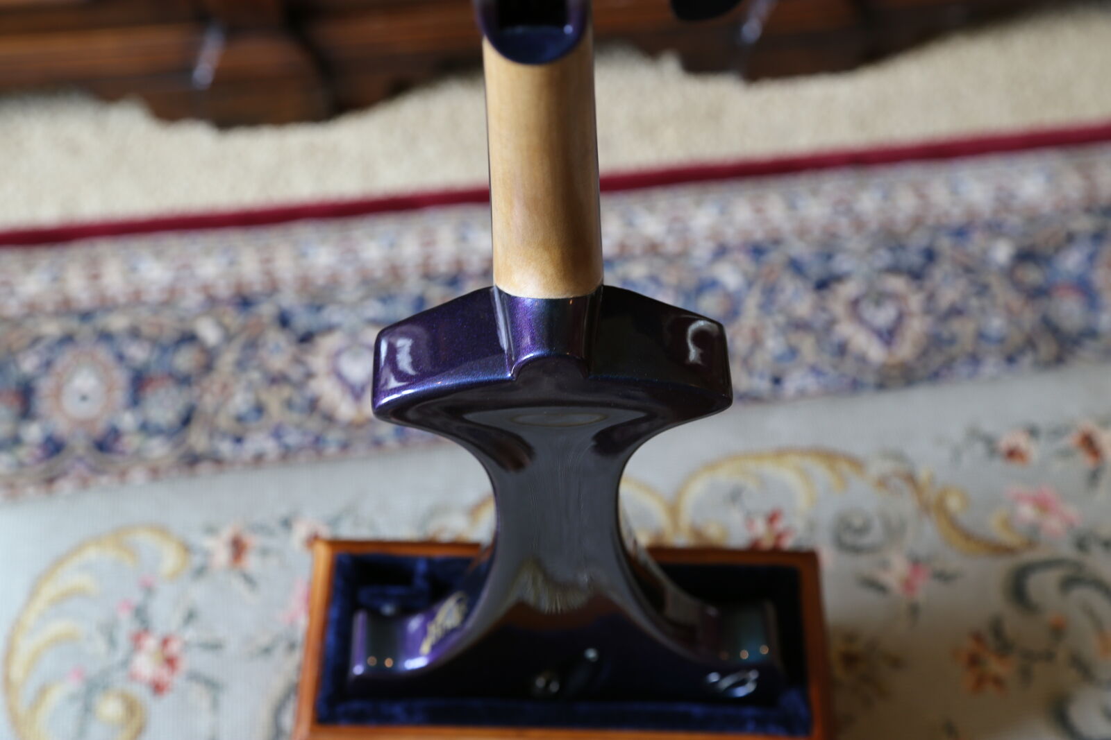 Hard Oblong Case w/ Shaped Interior Black Canvas Cover w/ Large Music Pocket Plush Red Velvety Lining 4 Bow Holders Black Fibre Bow w/ Ebony Frog, Nickel Fittings & Winding
