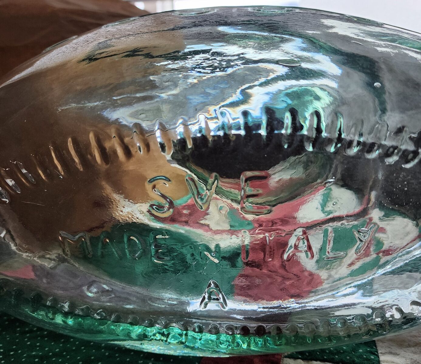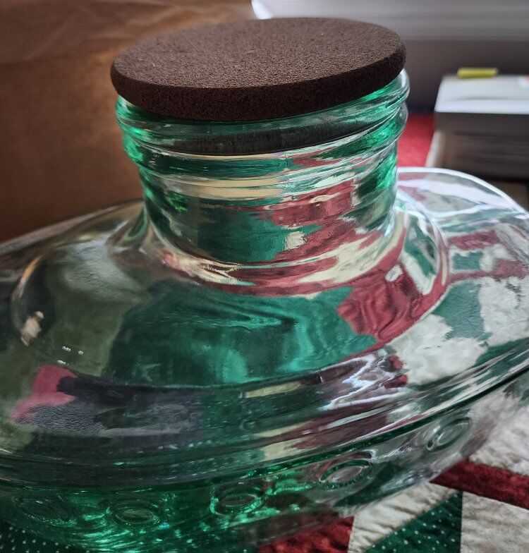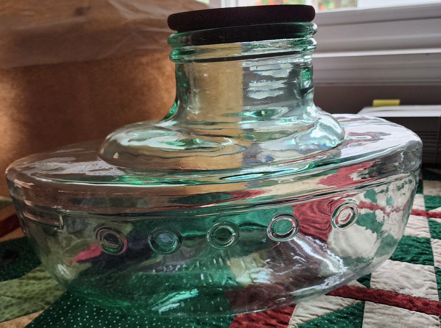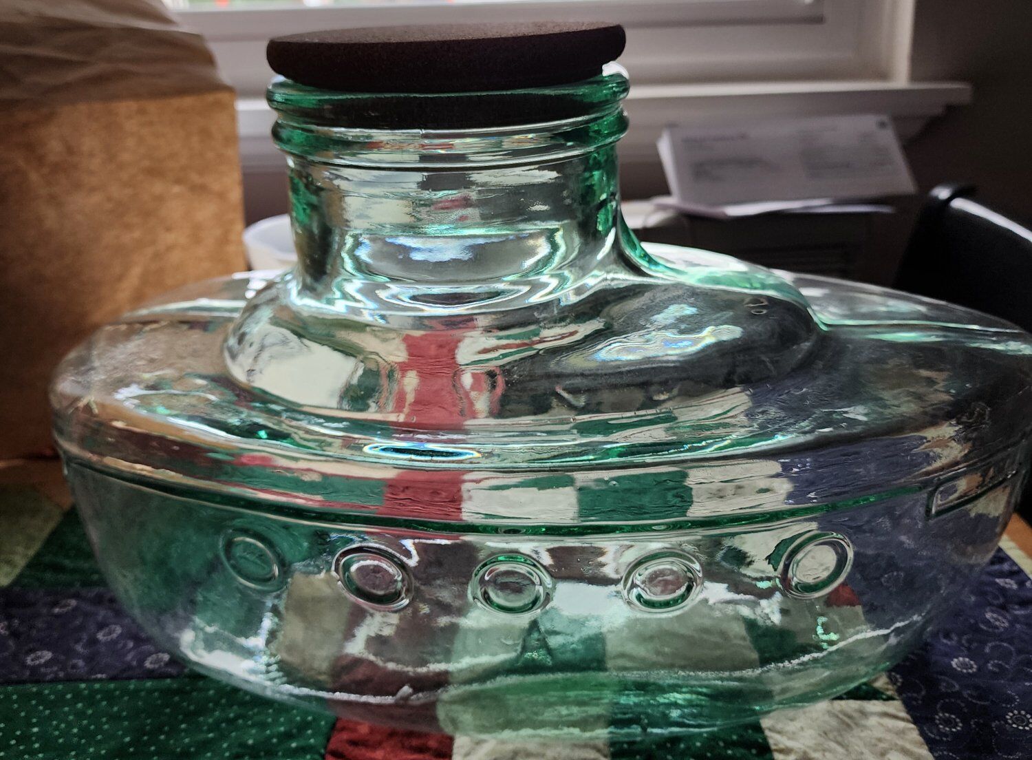 Cookie jar or fill with shells or ocean art. no end to what you could do. has cork lid, no chips. made in Italy 16" long 9" wide 11" at tallest point. pale green glass.