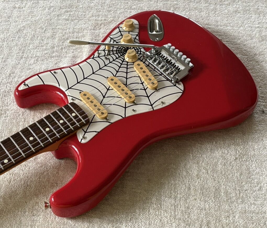 All electronics work as intended. Neck is straight and frets are clean. Truss rod adjustment is at heel and works as intended. Spiderweb pickguard is not original and guitar body has a couple extra screw holes to accommodate this. The tremolo arm isn’t original but works fine with this unit. Body and neck are both in great shape for 40 years old.