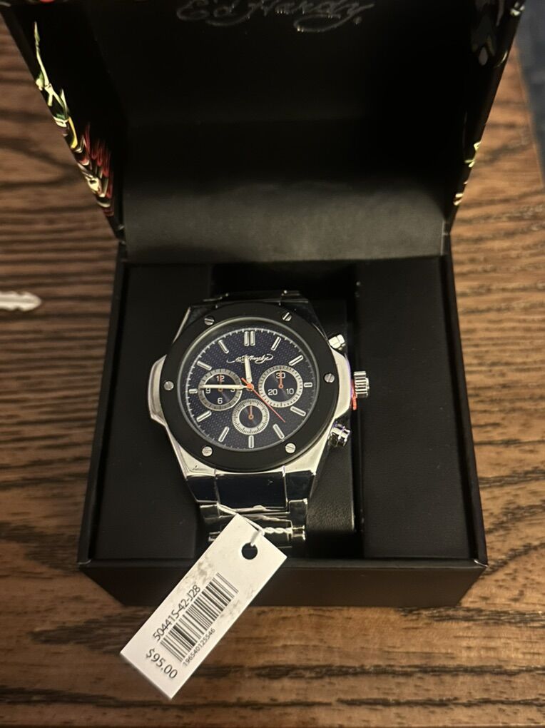 ApplePayEd Hardy Stainless Steel Men’s Watch – Brand New in Box – Bold Style for Bold Men K ok Turn heads with this brand new Ed Hardy men’s chronograph-style watch, still in its original tattoo-inspired box. Rocking a deep blue dial, bold stainless steel band, and Ed Hardy’s unmistakable flair, this timepiece is all about making a statement.