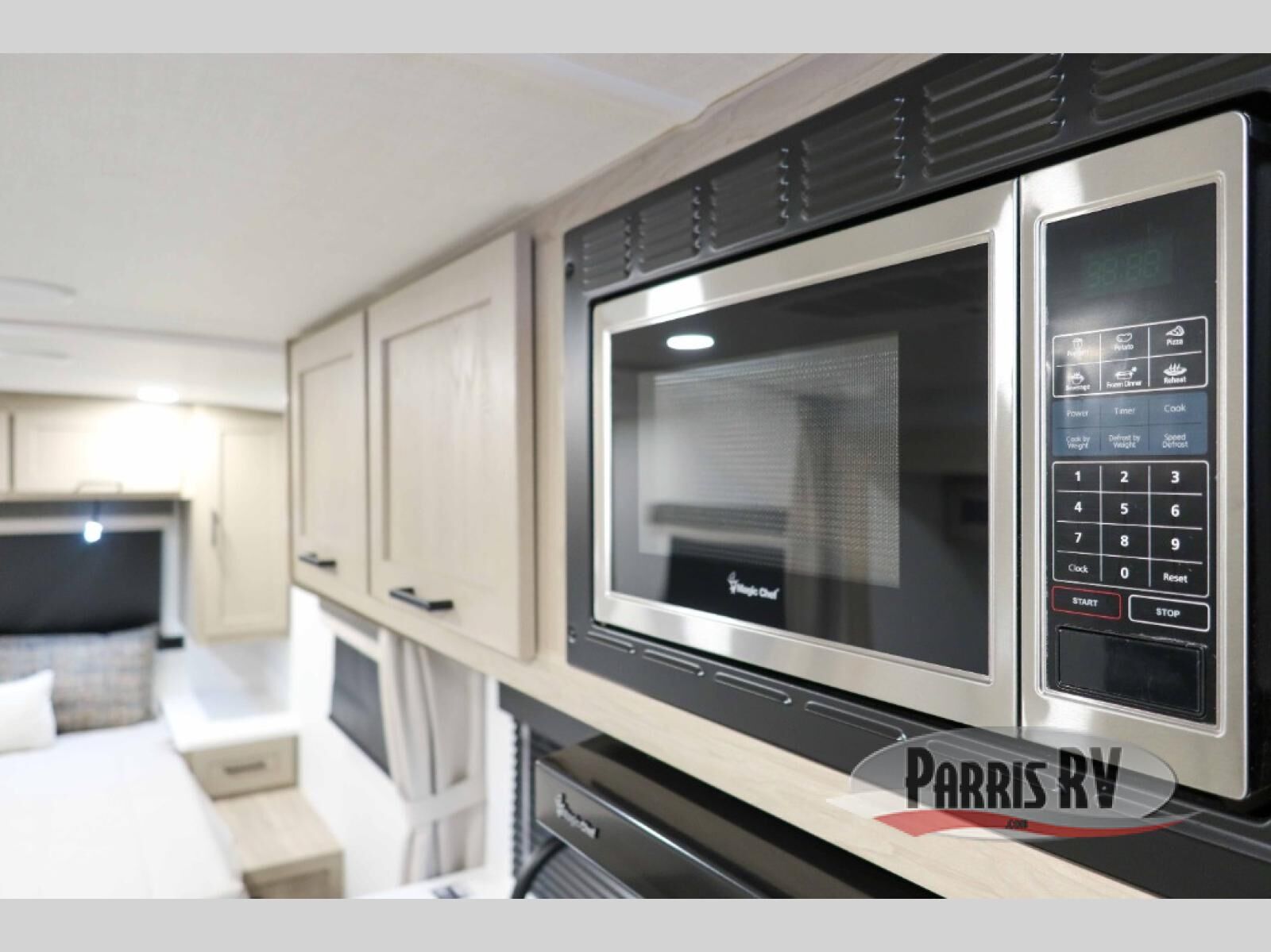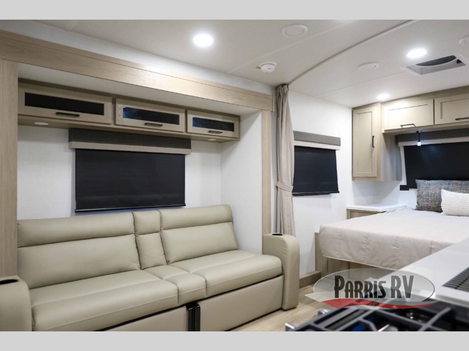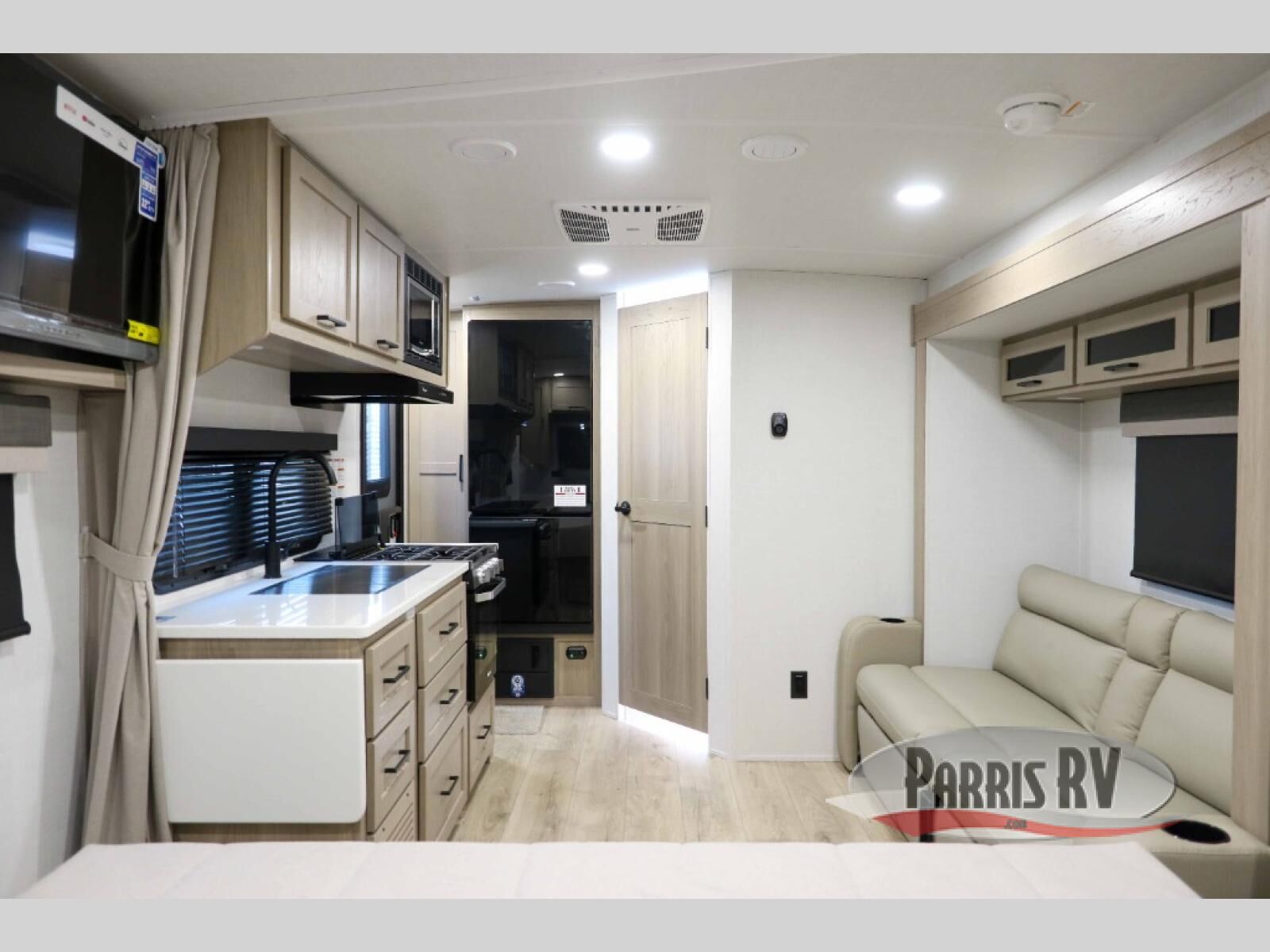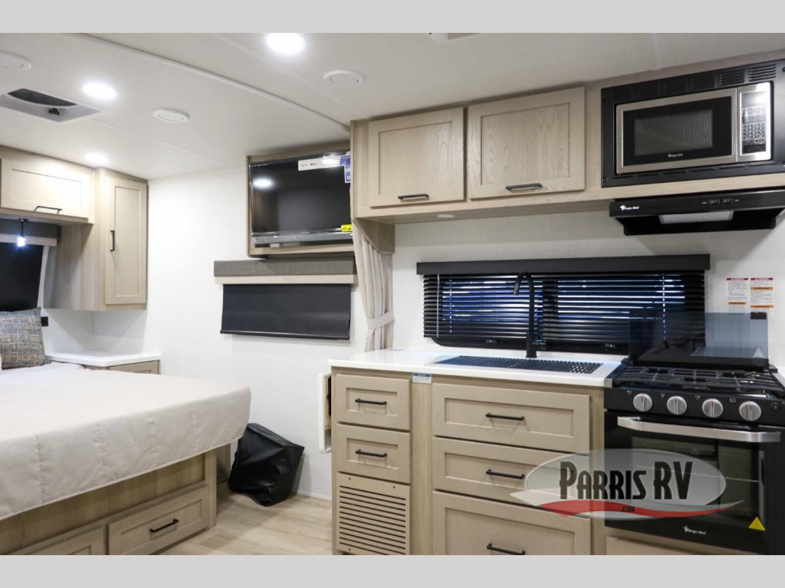 Wherever you decide to camp, you will love every minute in this cute couple's trailer. The sofa slide with a table will provide a place to relax, eat, and even sleep an extra guest if you have one, and the front RV queen bed includes a privacy curtain to enjoy your own space. There are dual bedroom wardrobes to keep your clothes tidy, and you'll find two pass-through storage compartments for your larger gear. An outside griddle with an LP hookup will allow you to make breakfast outdoors, and there is a three burner cooktop indoors if the weather isn't cooperating. Since there is a full bath on board you won't have to use the camp's facilities, and you can make it a movie night with the 32" TV in the main living area!