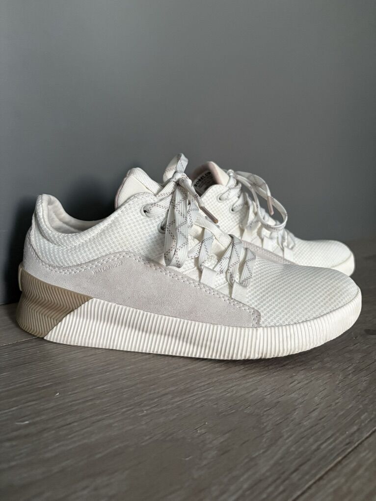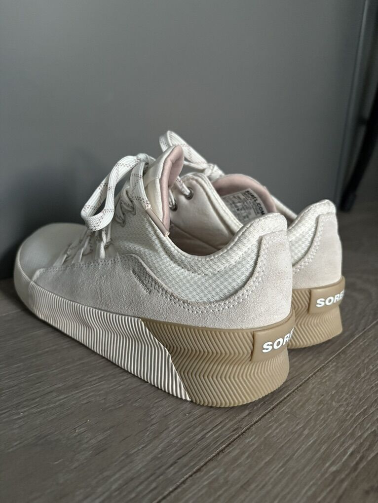 ApplePaySorel Out 'N About III Plus Lace Sneaker in the color Sea Salt. In like new condition, only worn once. $167 new. Very clean & well kept. Super cute & comfortable. Off white/cream with light pink accents. Waterproof. From a pet free & smoke free home. Women’s size 7. OBO