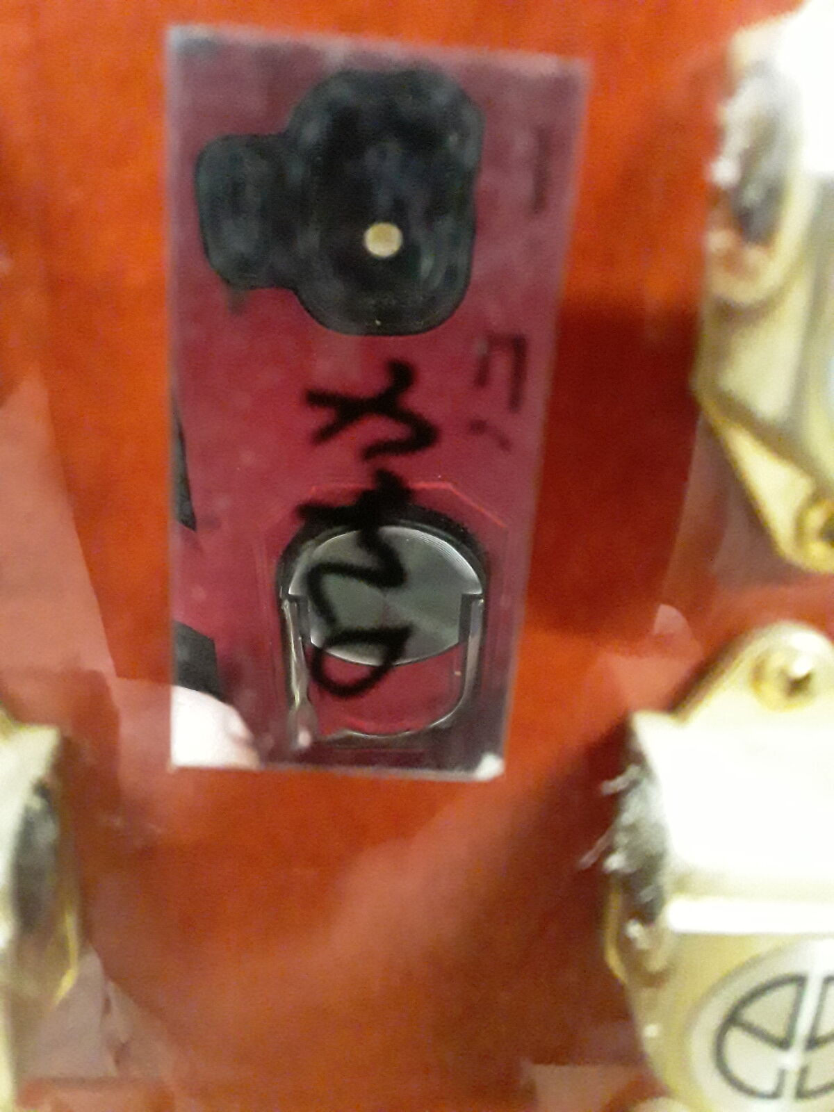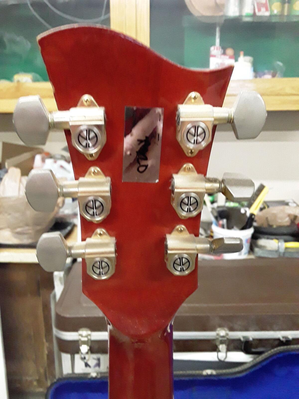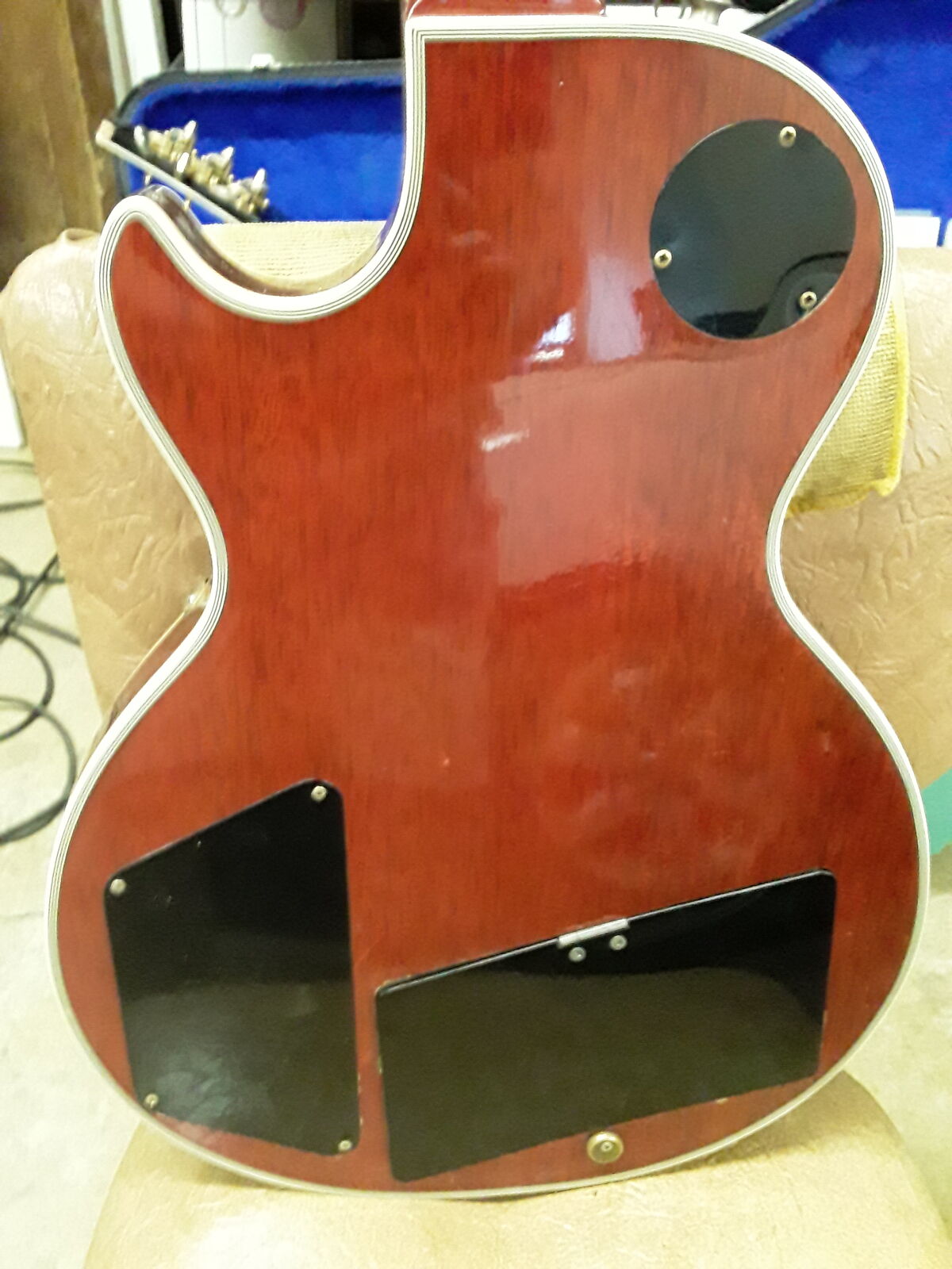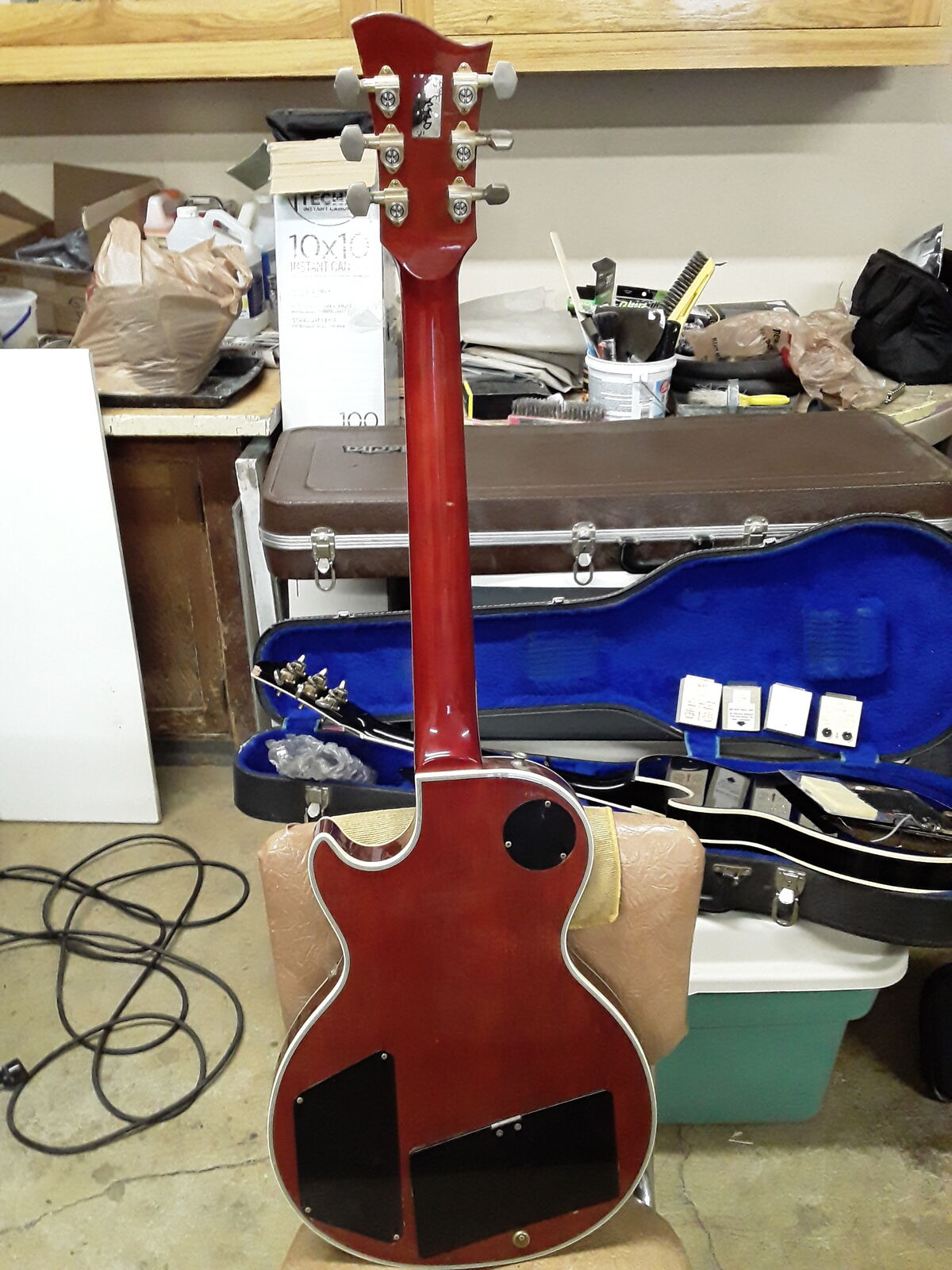 Set neck LP style, transparent red with black pickguard, gold hardware, two Magnaflux pickups. MPC onboard electronics. Spectrum Circuitry on 5 way selector