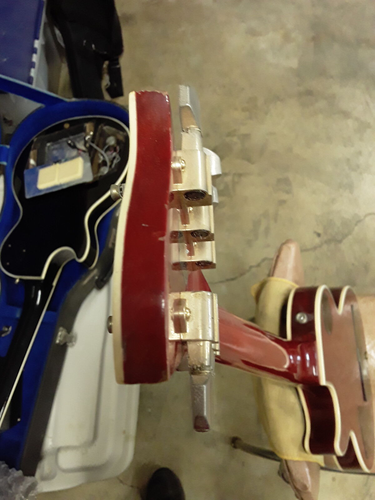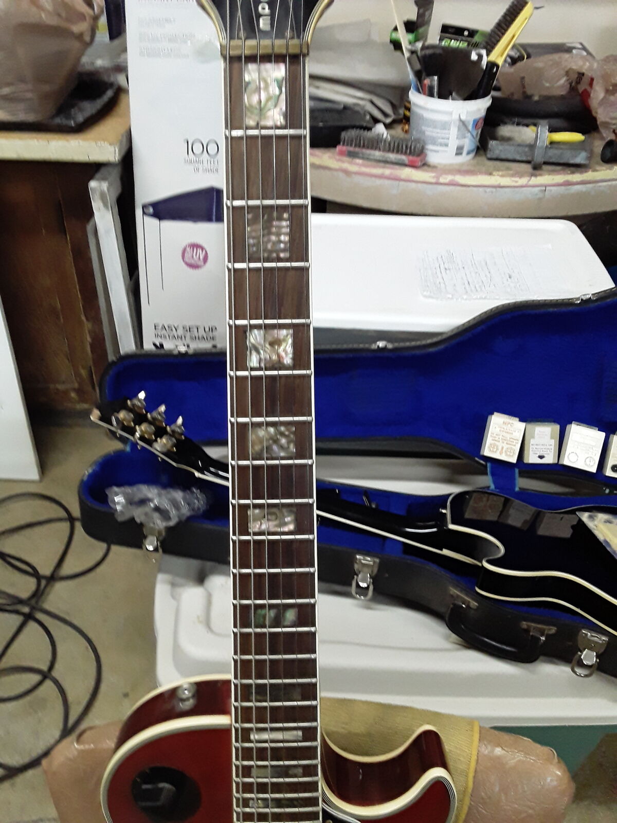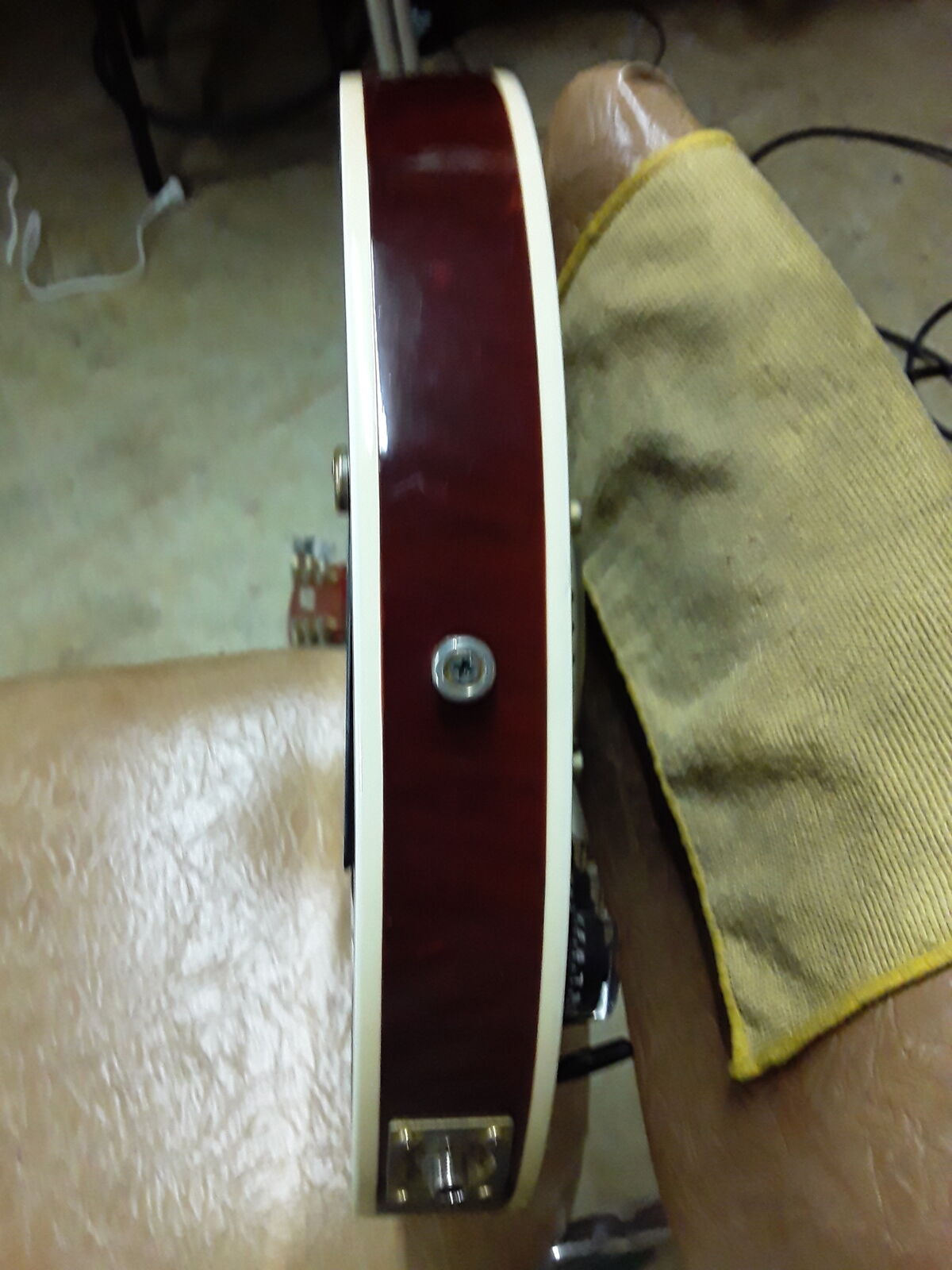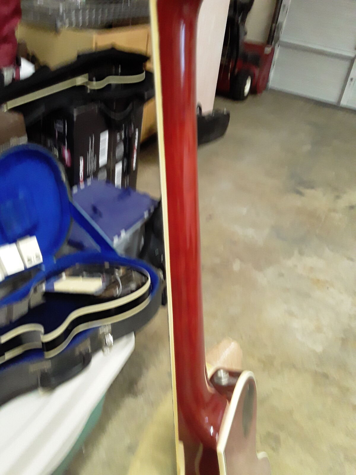 Set neck LP style, transparent red with black pickguard, gold hardware, two Magnaflux pickups. MPC onboard electronics. Spectrum Circuitry on 5 way selector
