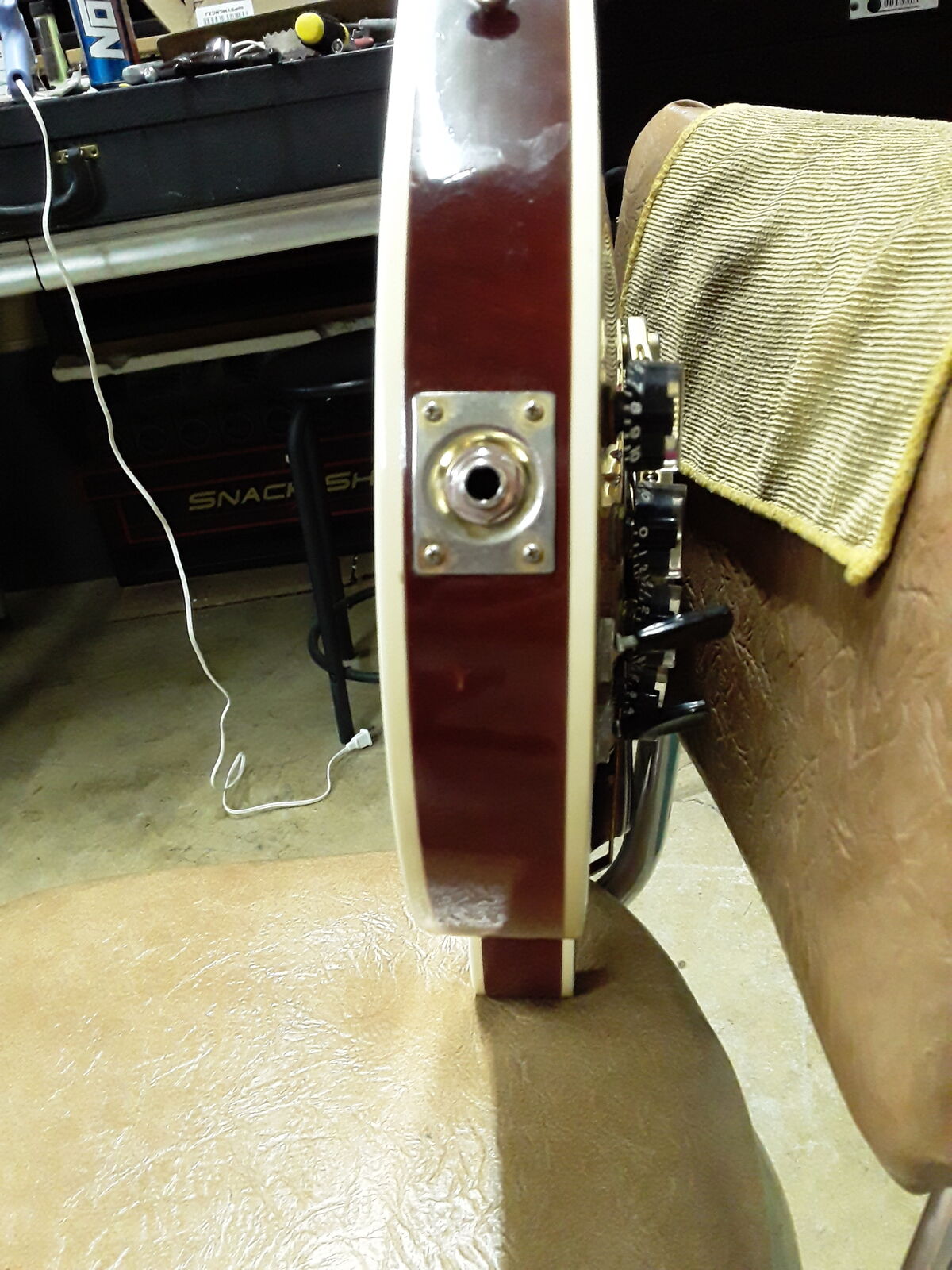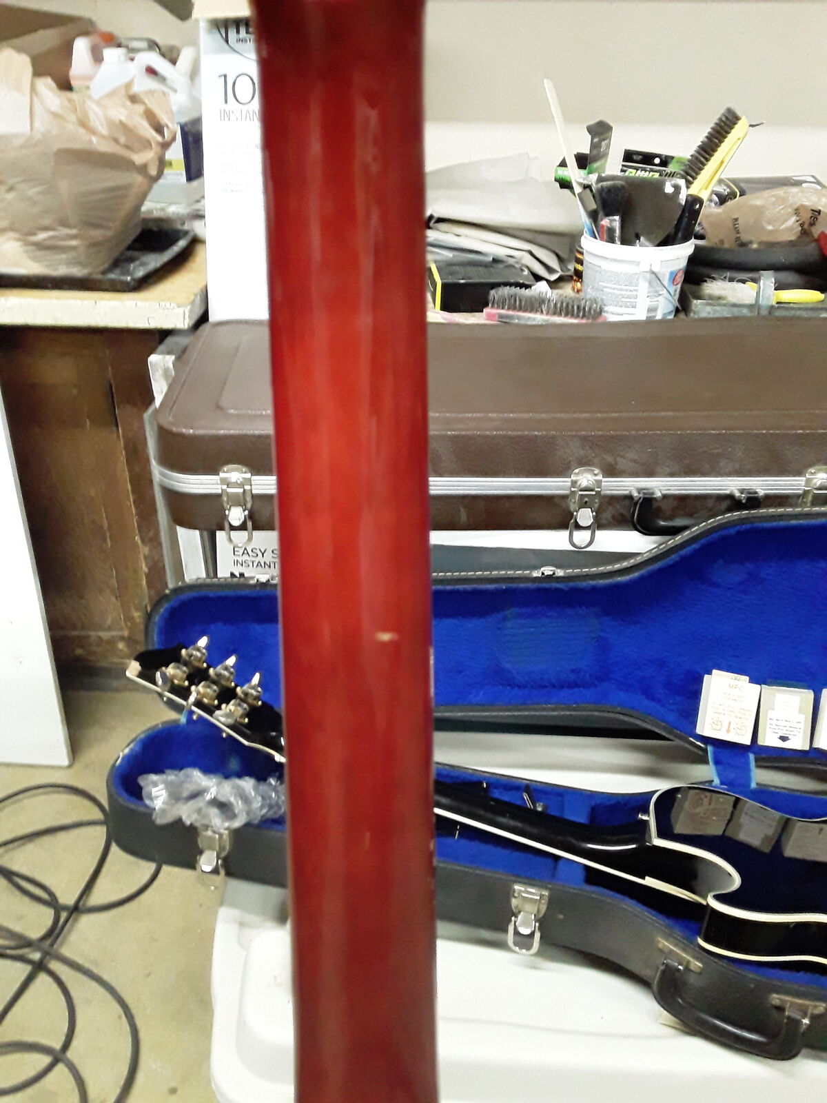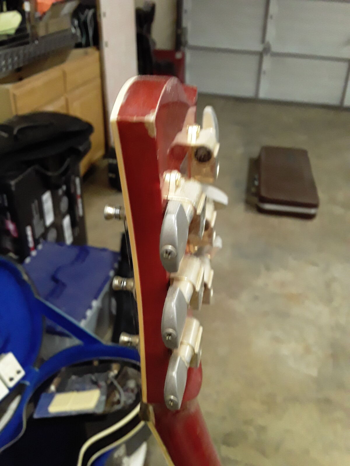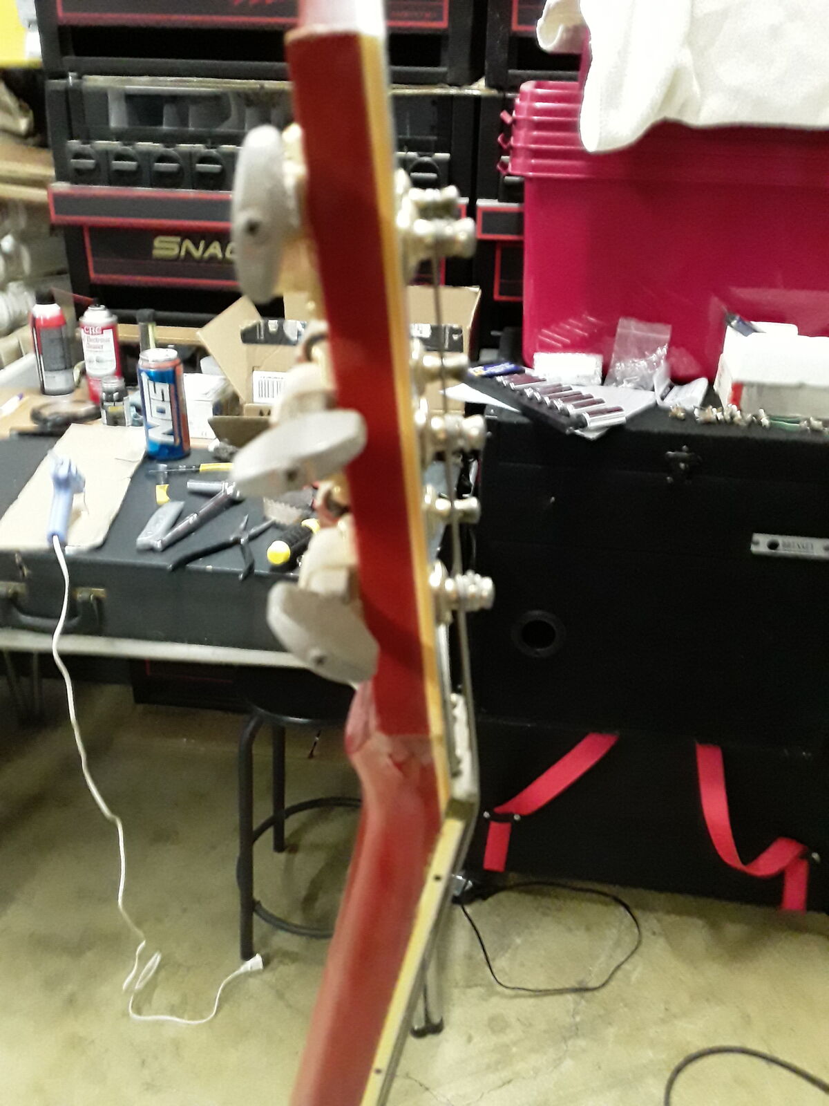 Set neck LP style, transparent red with black pickguard, gold hardware, two Magnaflux pickups. MPC onboard electronics. Spectrum Circuitry on 5 way selector