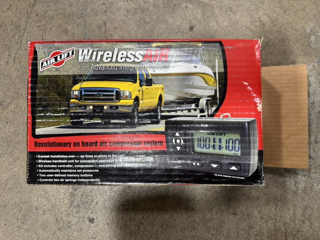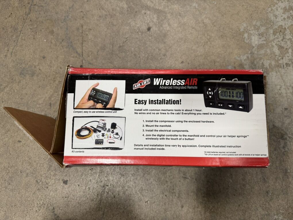 With the touch of a button, control the pressure in your air springs from the cab of your vehicle. Advanced air system diagnostics such as leak detection and compressor communication failure. The system adjusts and automatically maintains set pressures. Control two air springs on one axle with WirelessAIR. Not designed for use with a tank. Weather resistant manifold is waterproof up to 2 feet for maximum life expectancy and protection from harsh environments WirelessAIR provides dual path airflow for your vehicles air springs. Left and right air springs can be set to independent pressures. Allowing to adjust for more weight on one side of the vehicle than the other. 2 programmable pressure settings for the loads you tow or haul the most. As an added safety measure, WirelessAIR automatically senses low air spring pressure and immediately activates to maintain a safe pressure level. All Air Lift compressor systems are compatible with any brand of air springs.