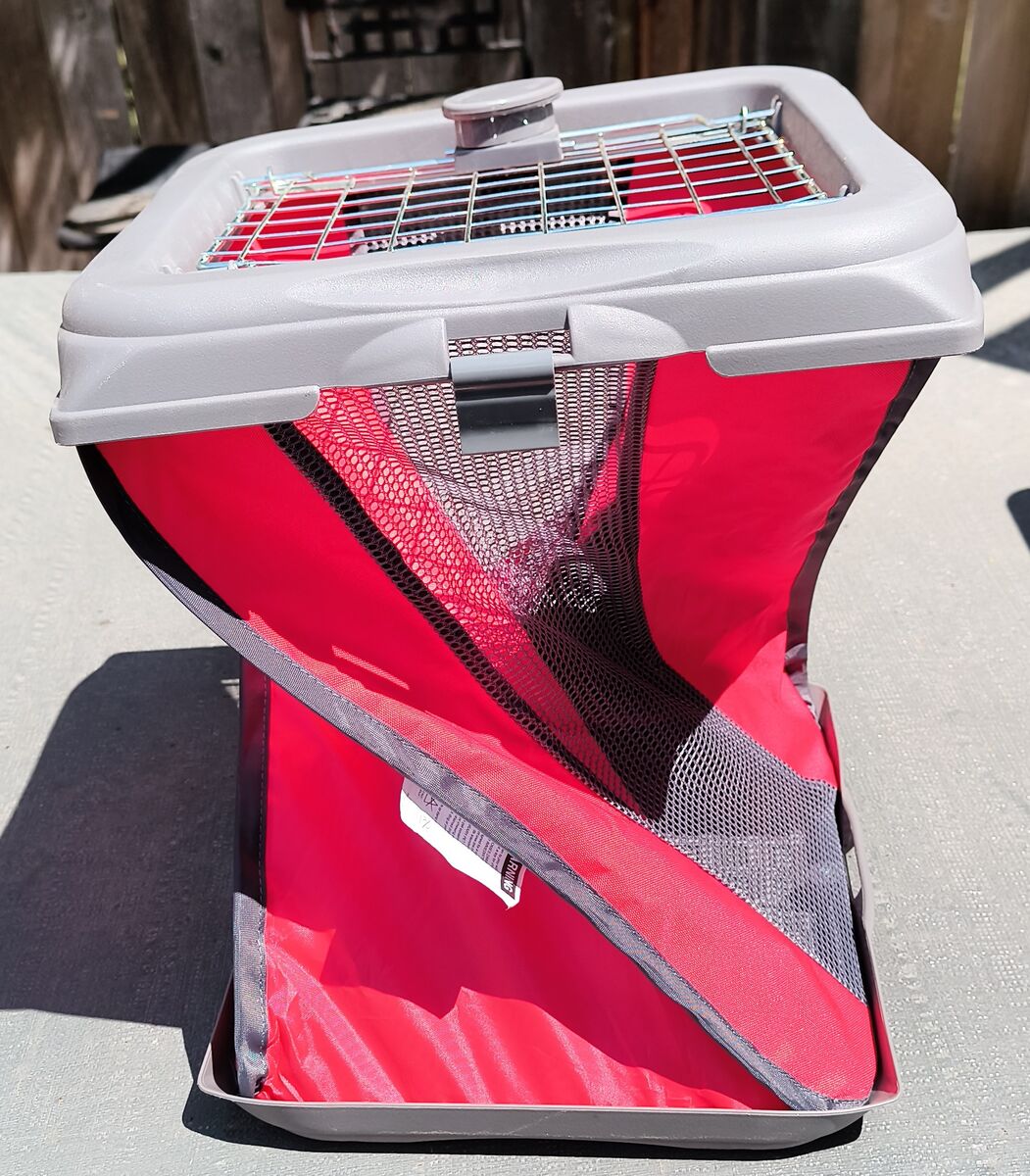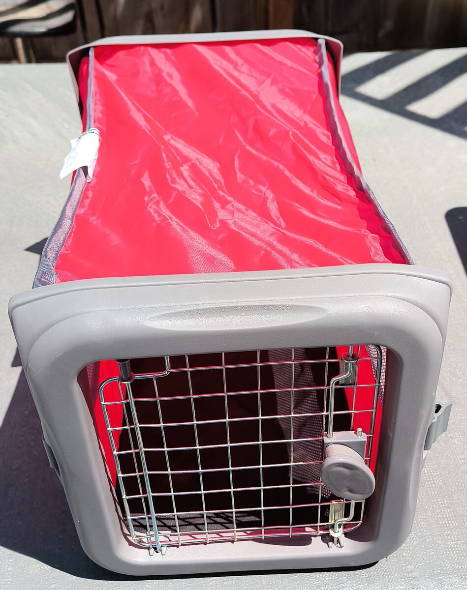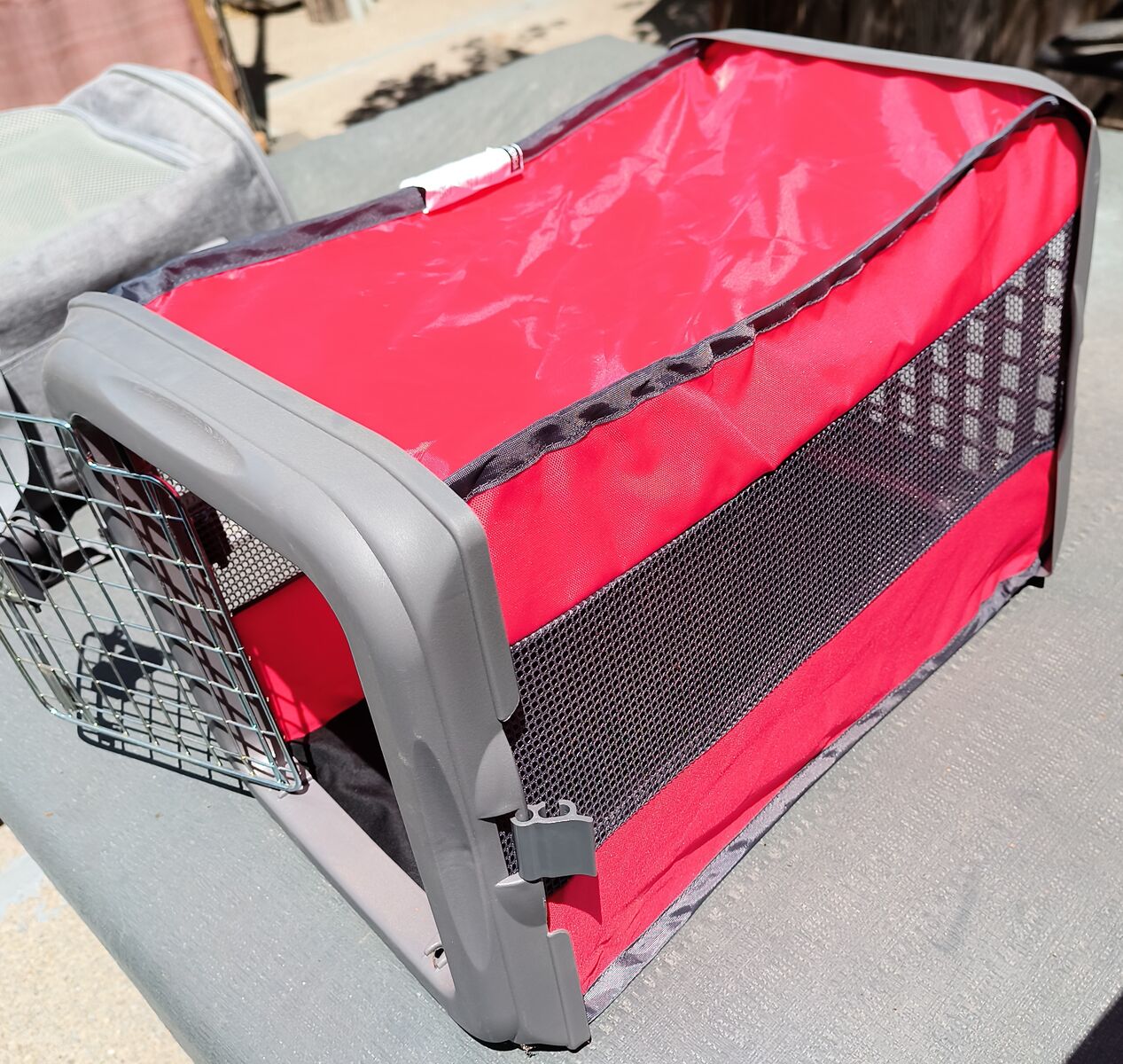ZelleThis is a very nice fold up pet carrier for a small dog, cat or gerbil. Tried to show the pictures of it unfolding so you can see what it does, easy to twist it shut and snap the two latches. In inches: 20x14x12. Very clean and in perfect shape. When folded takes up very little space. Could ship for $15.