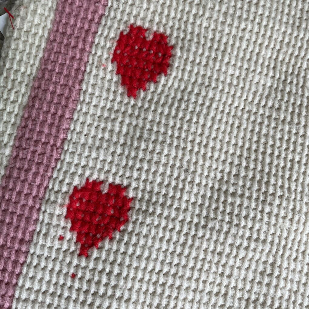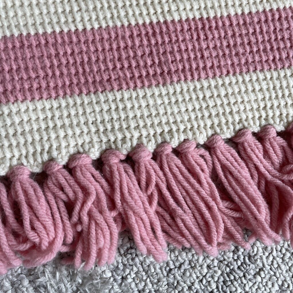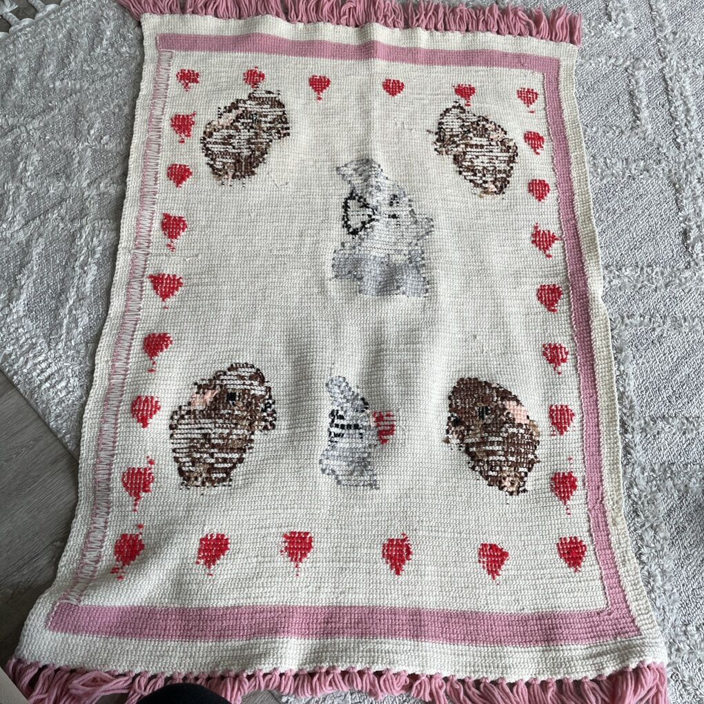 VenmoAfghan Blanket Throw Hand Crochet Mauve&cream bunnies hearts vintage 33”x49”