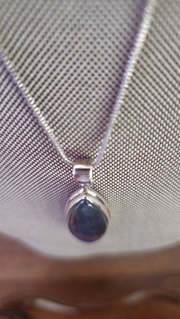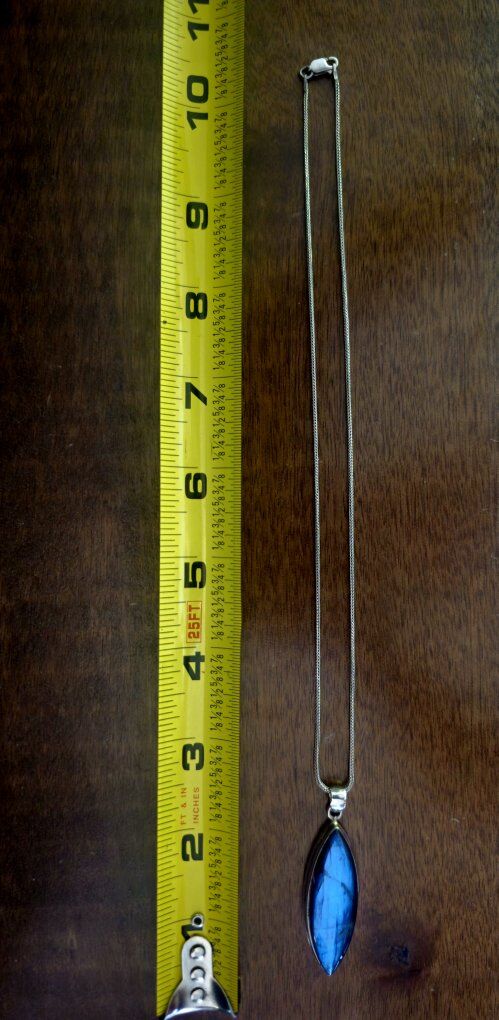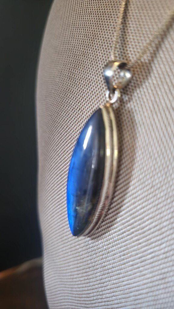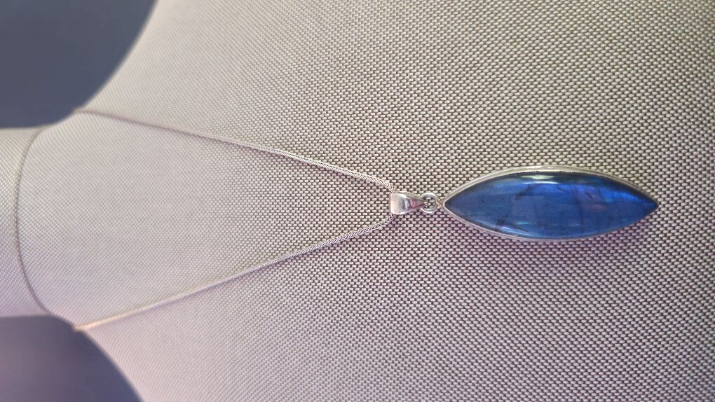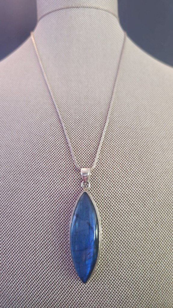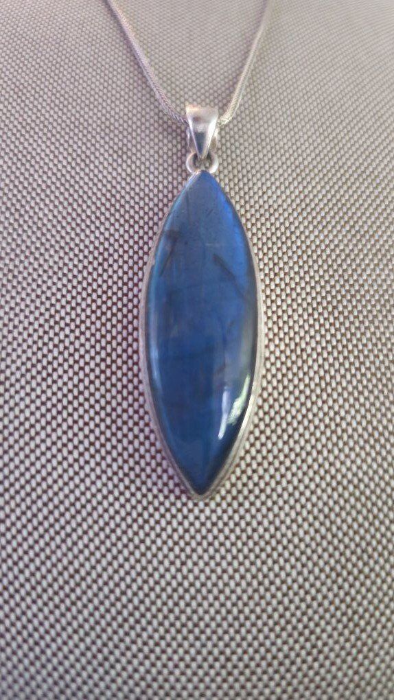 WOW!! This is SO beautiful!! Hefty MARQUISE shaped 1.5" BLUE FLASH LABRADORITE pendent that shimmers like no other!! Outlined in substantial layered Sterling Silver (925) and open in the back, allowing the light to show through this amazing stone.