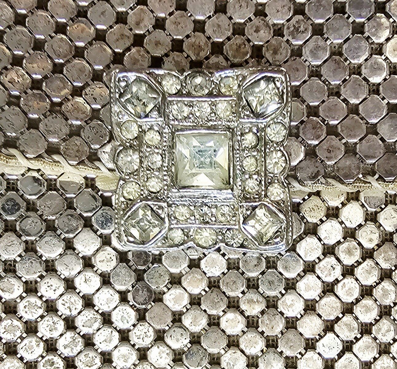 The mesh is clean and it's not missing any segments. The rhinestone clasp works perfectly and is not missing stones. There is one small interior pocket with a sewn in maker's tag.