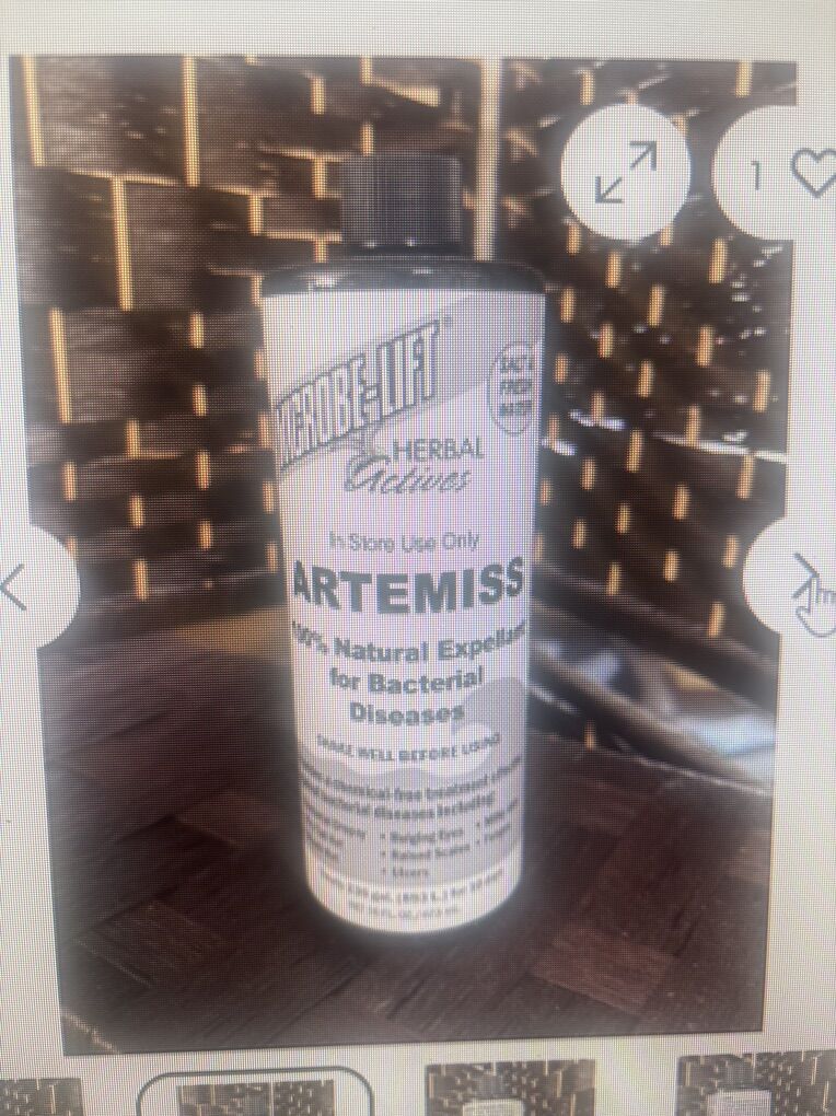 ZelleArtemissNatural Expellant for Bacterial Disease, Bulges my Eyes, Rather send Scales, Ulcers, For mugs, Milky Skin and more. There are 20 Bottles that I am selling for $5 each. If interested please call or text Jamie at 385-471-4333 thank you.
