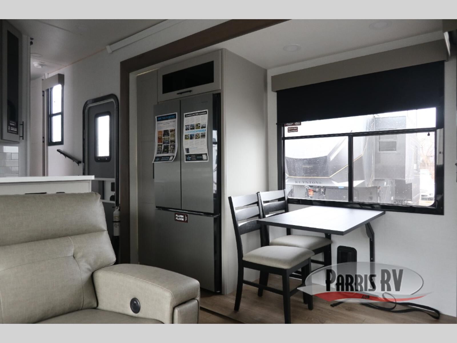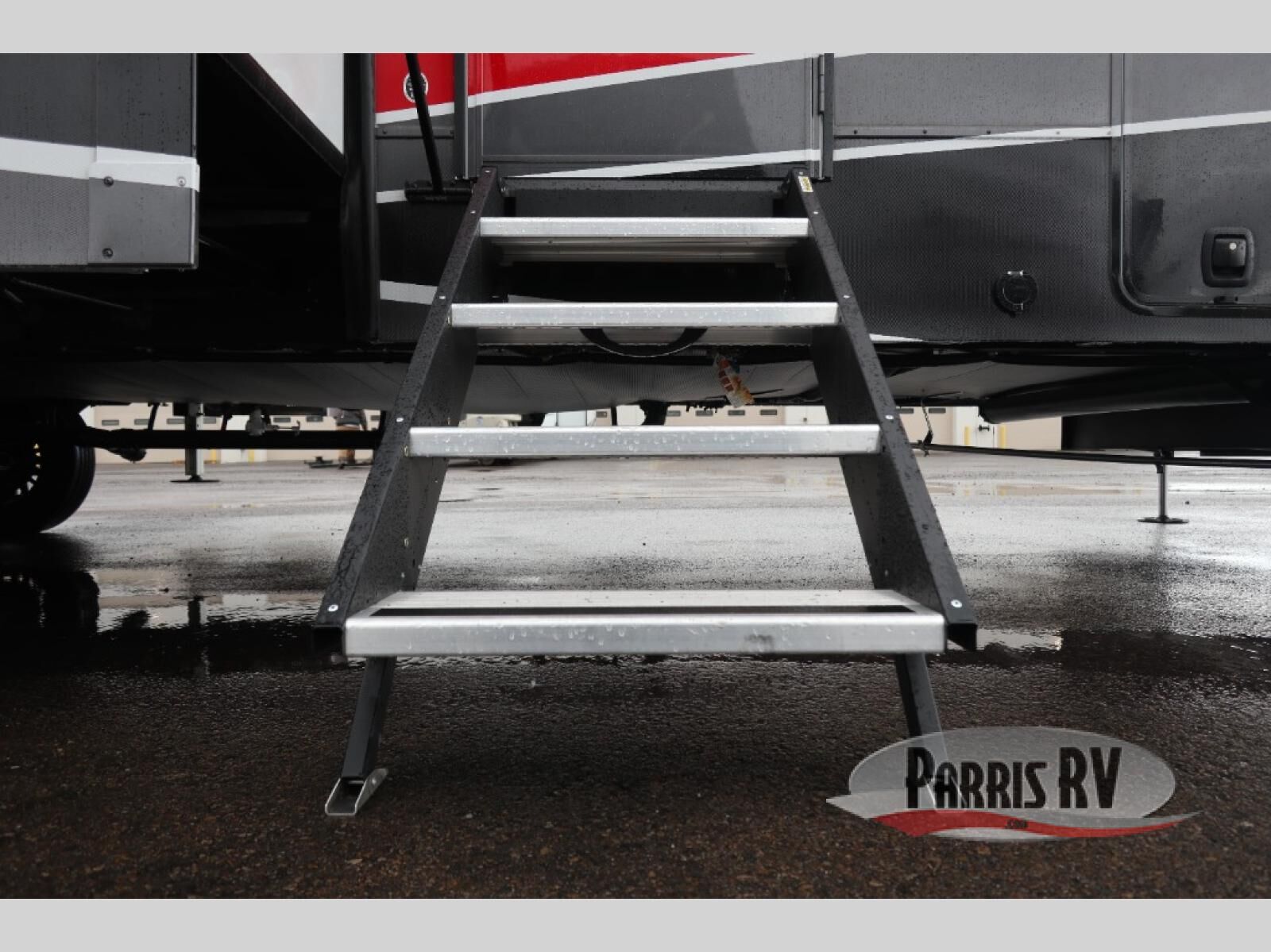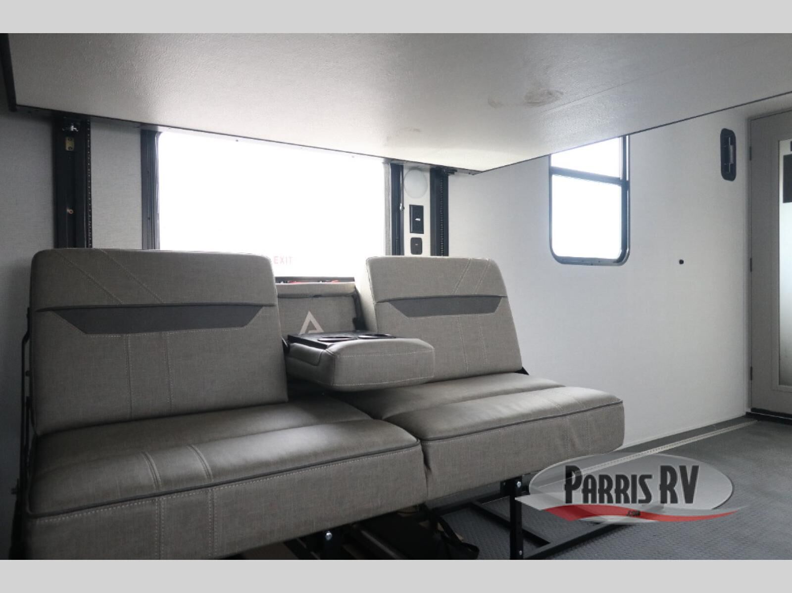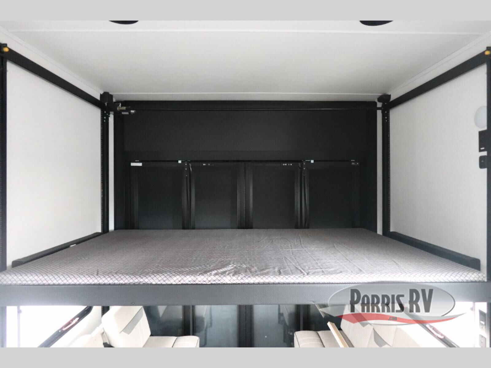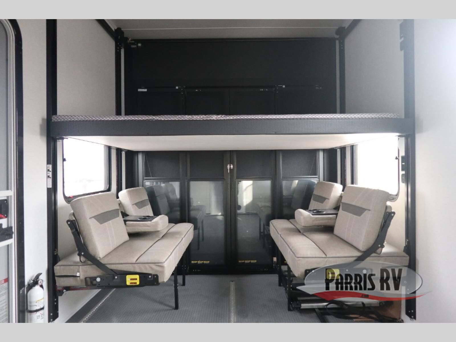 The whole gang will love camping in this toy hauler with a 14' garage for your toys and gear. Once you have arrived at your destination, you can set up the HappiJac roll-over sofas with a queen bed above them, and also a loft which opens to the garage area as well. A half bath is also available off the garage which is an added convenience for those sleeping in this converted area, and for those coming in off the trail so that they do not have to track all through the main unit to use the bathroom. The chef can prepare great meals for their hungry crew with the fully equipped kitchen including a four burner cooktop, a stainless steel 12V refrigerator, large sink, and plenty of countertop prep space. The rest of the gang can be relaxing on the large L-shaped sofa slide watching the 50" HDTV and enjoying the fireplace, or playing a game of cards at the dining table with four chairs. The front private bedroom features a king bed slide for more interior space, a flip top dresser for all of your belongings, and a front wardrobe with washer and dryer prep, plus it has an entrance into the dual entry bathroom!
