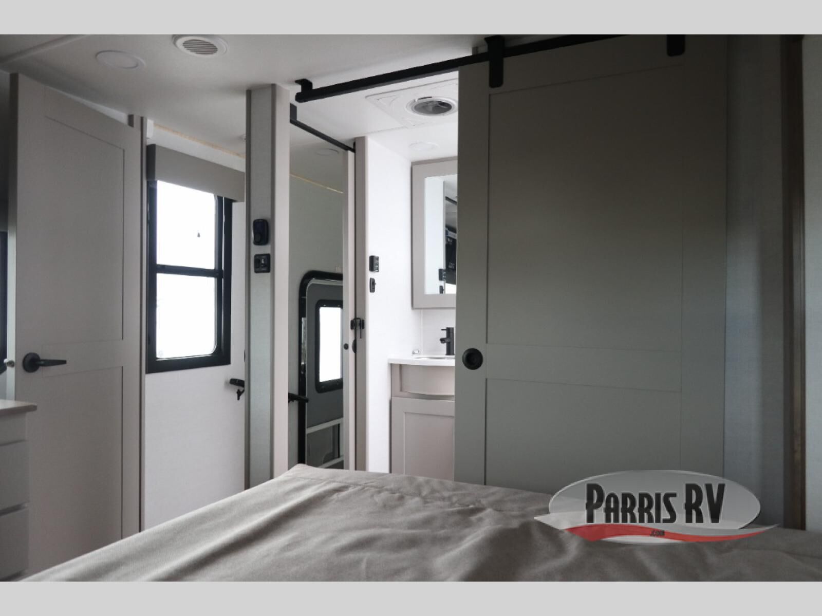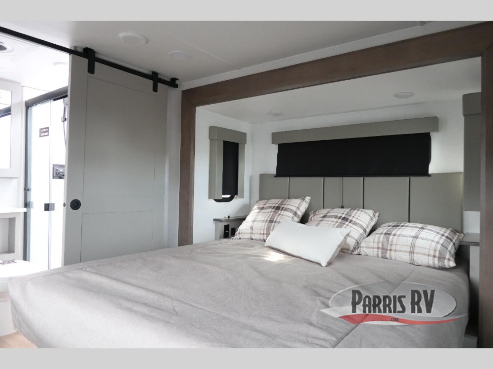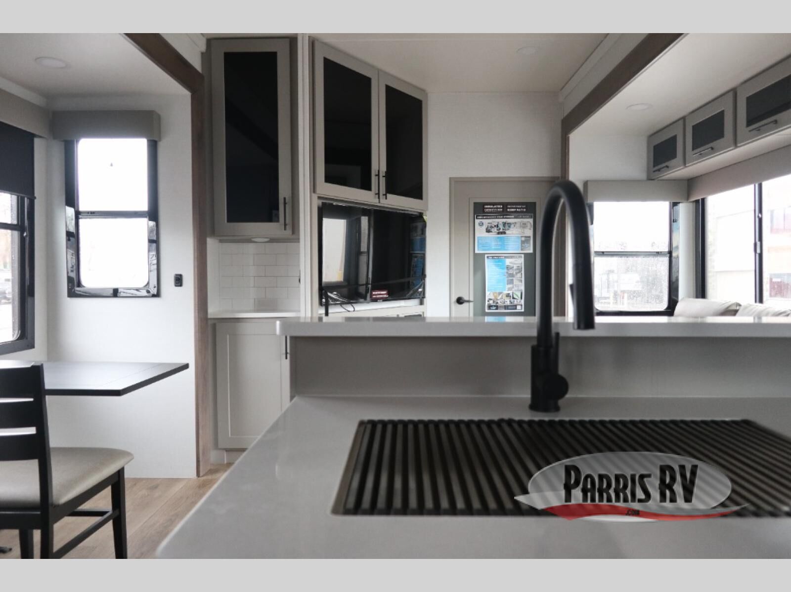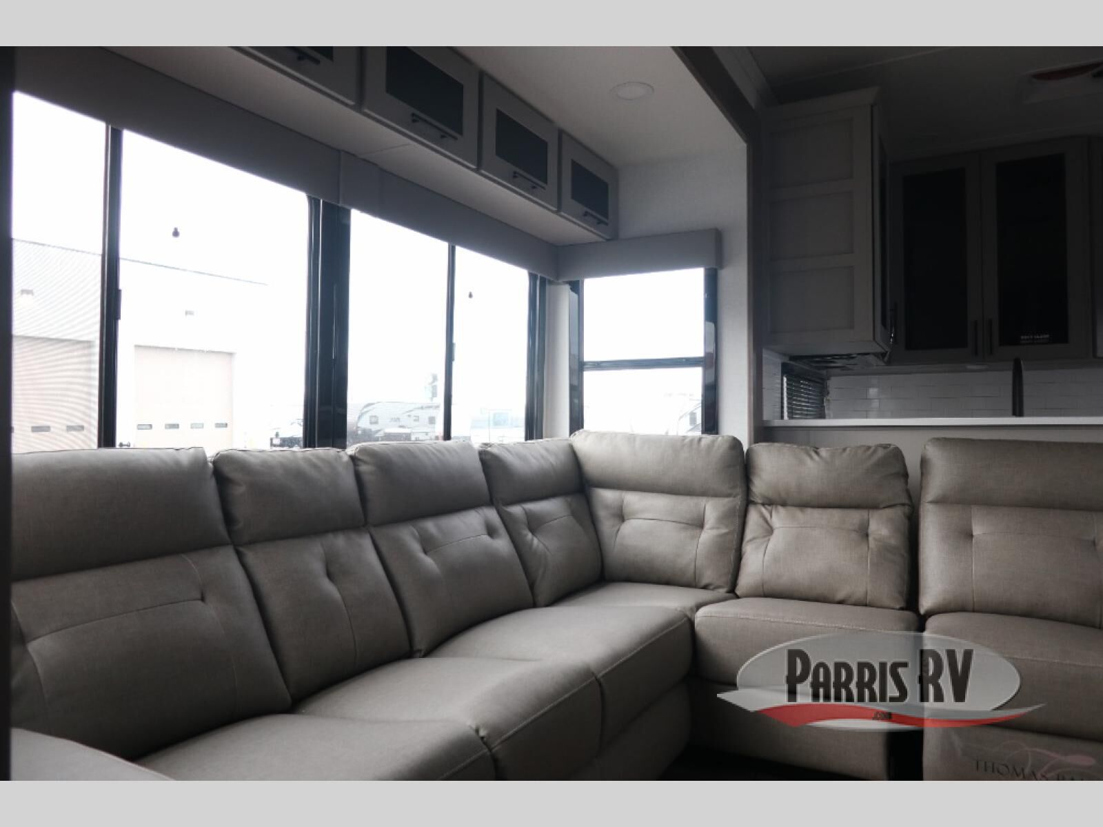 The whole gang will love camping in this toy hauler with a 14' garage for your toys and gear. Once you have arrived at your destination, you can set up the HappiJac roll-over sofas with a queen bed above them, and also a loft which opens to the garage area as well. A half bath is also available off the garage which is an added convenience for those sleeping in this converted area, and for those coming in off the trail so that they do not have to track all through the main unit to use the bathroom. The chef can prepare great meals for their hungry crew with the fully equipped kitchen including a four burner cooktop, a stainless steel 12V refrigerator, large sink, and plenty of countertop prep space. The rest of the gang can be relaxing on the large L-shaped sofa slide watching the 50" HDTV and enjoying the fireplace, or playing a game of cards at the dining table with four chairs. The front private bedroom features a king bed slide for more interior space, a flip top dresser for all of your belongings, and a front wardrobe with washer and dryer prep, plus it has an entrance into the dual entry bathroom!
