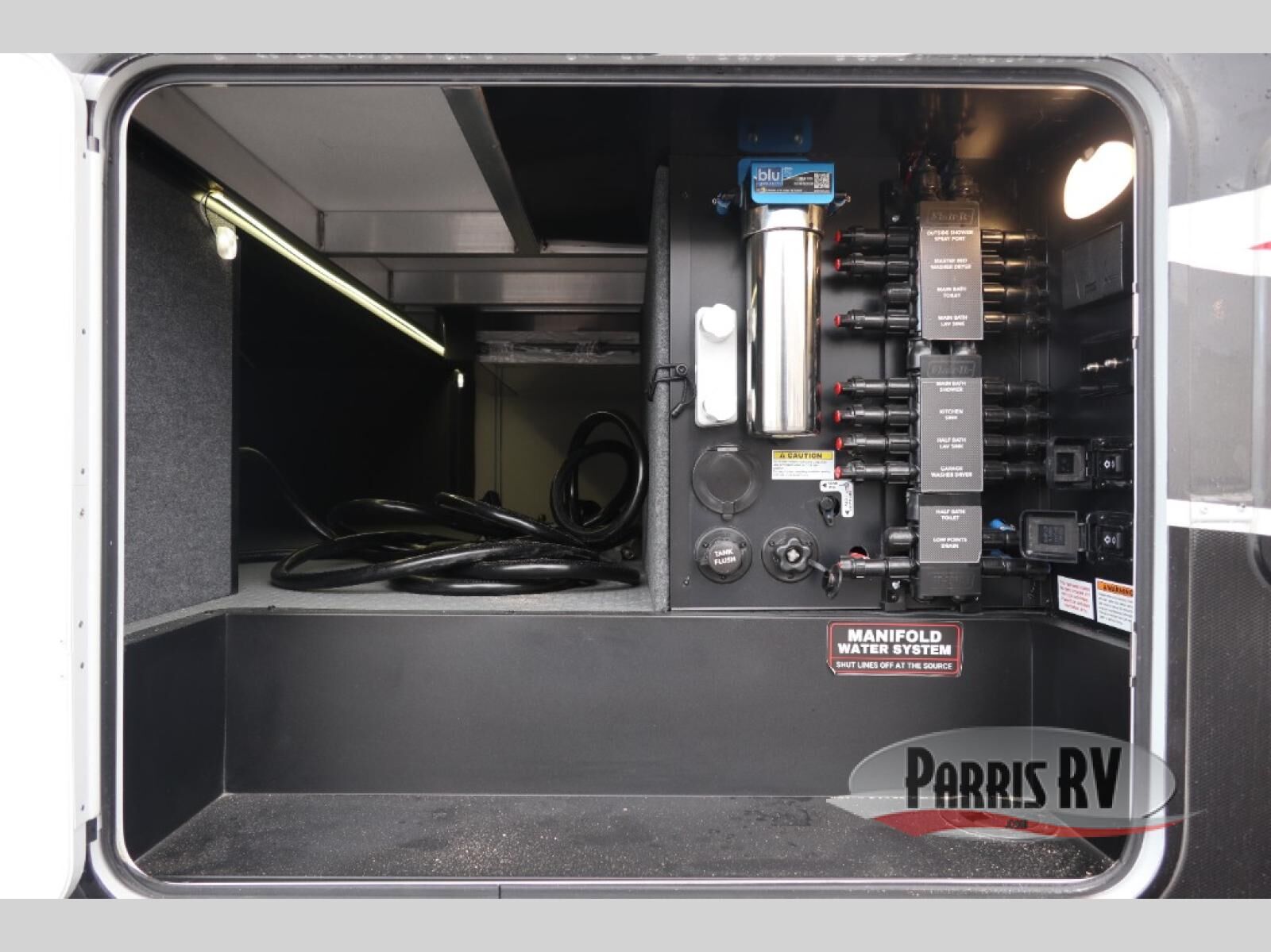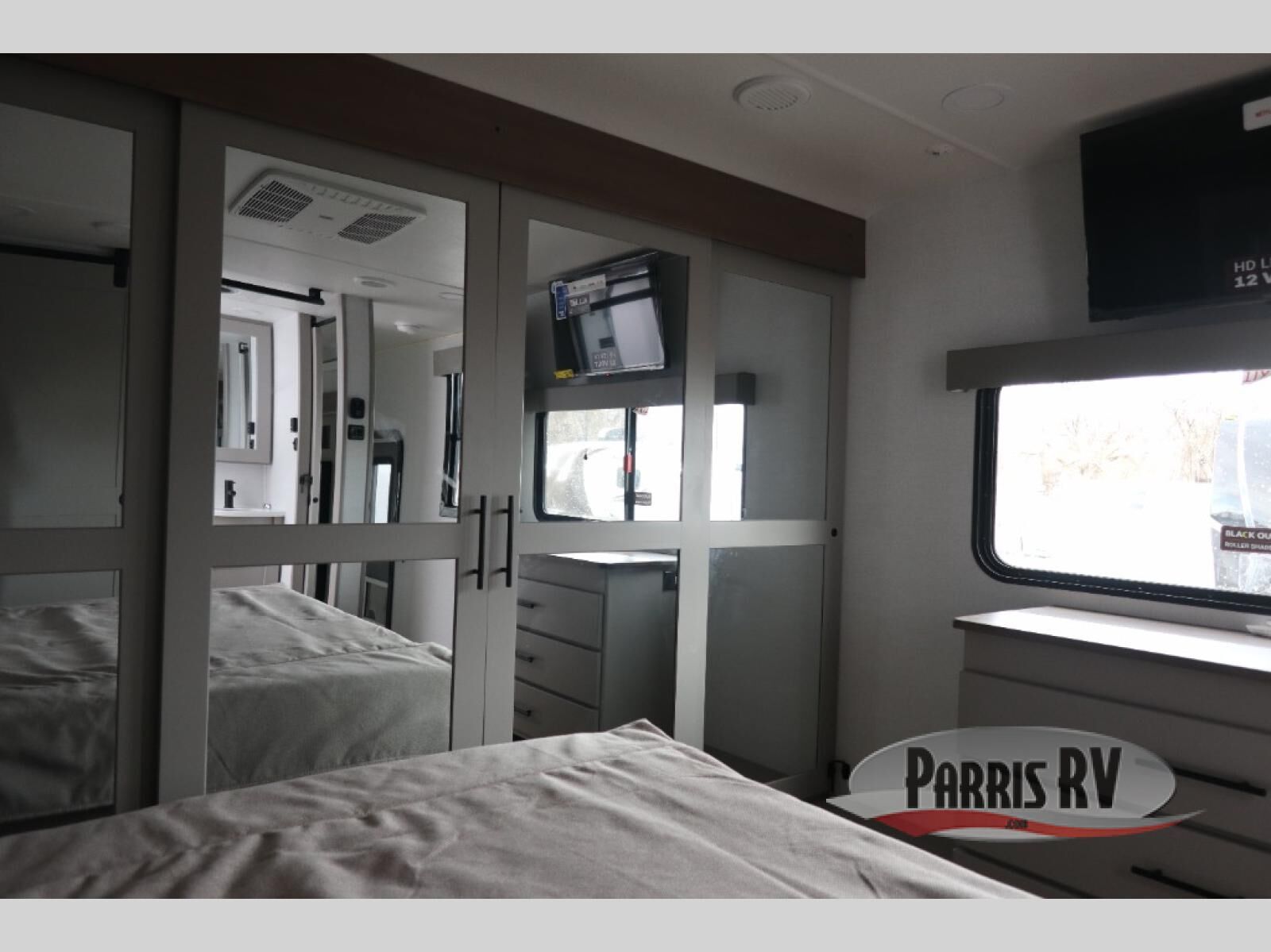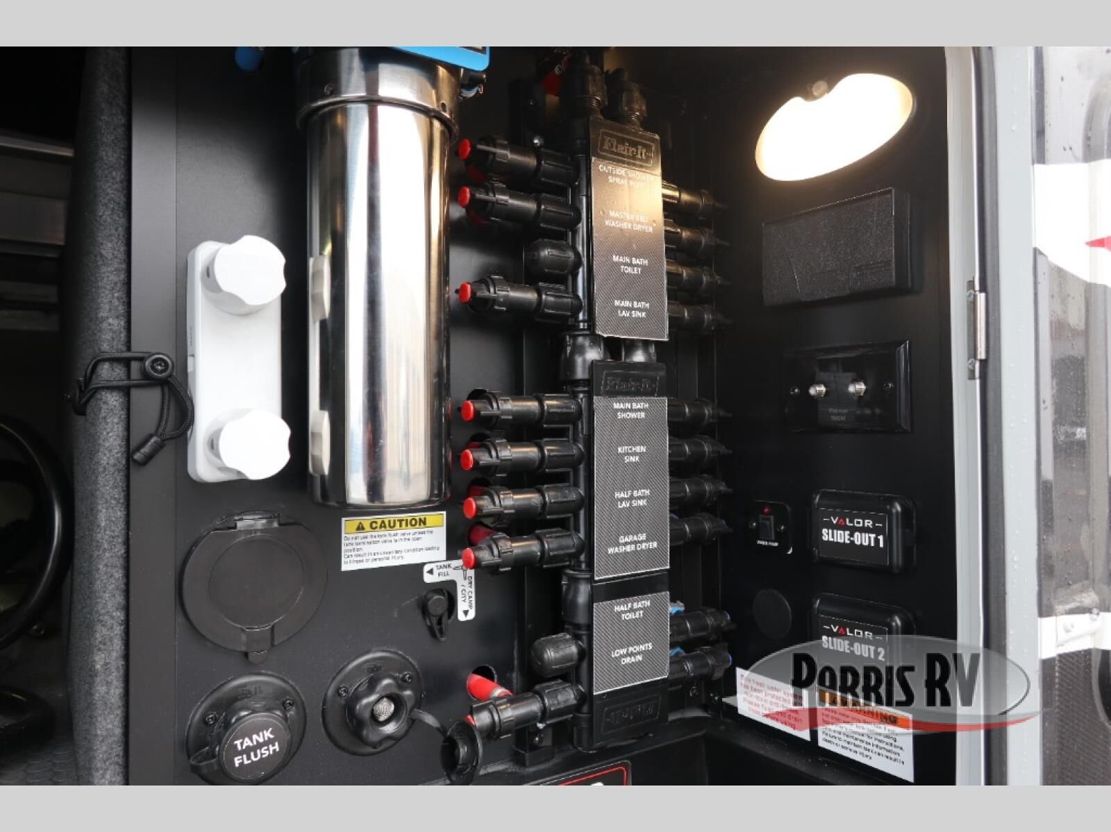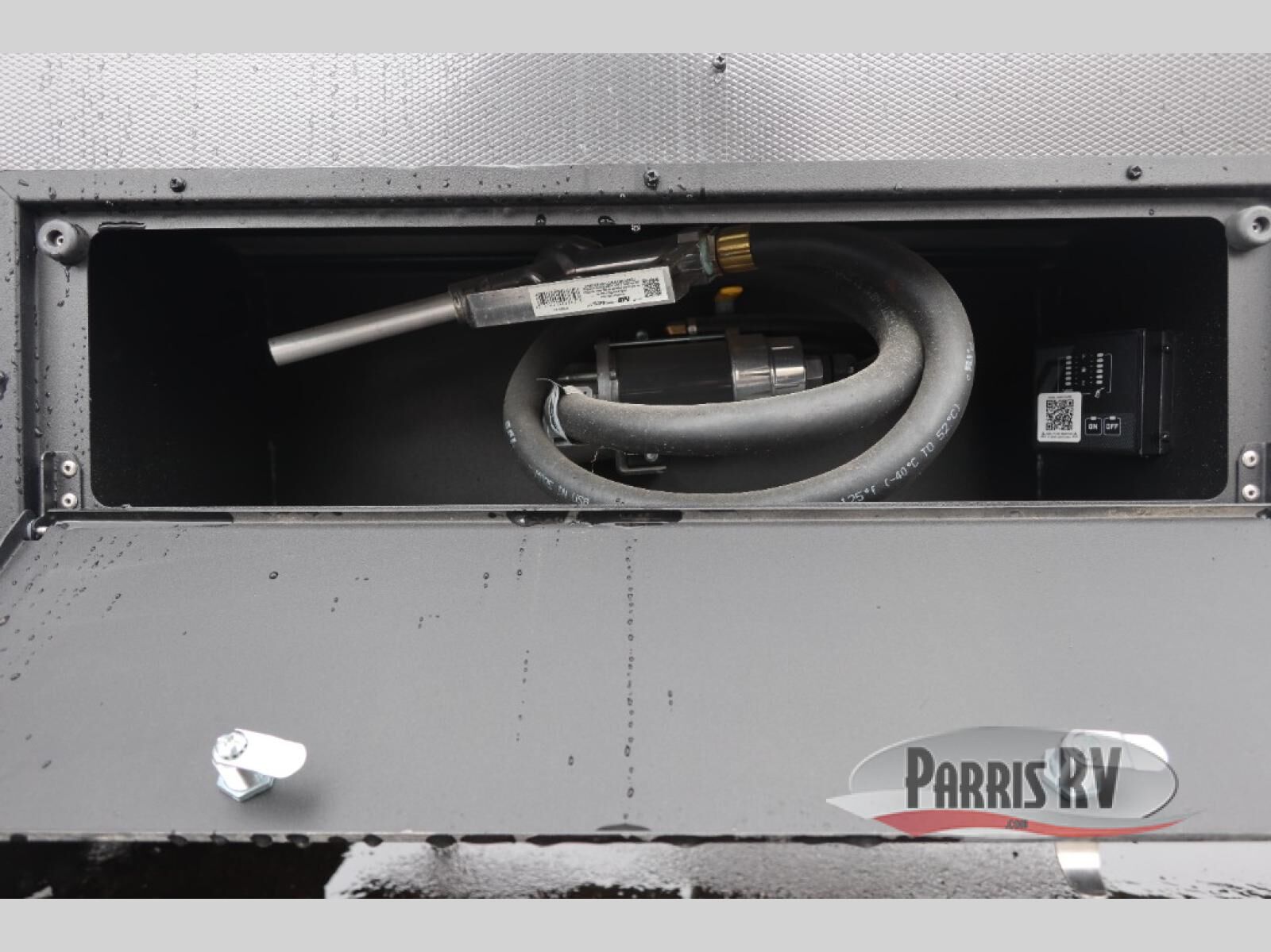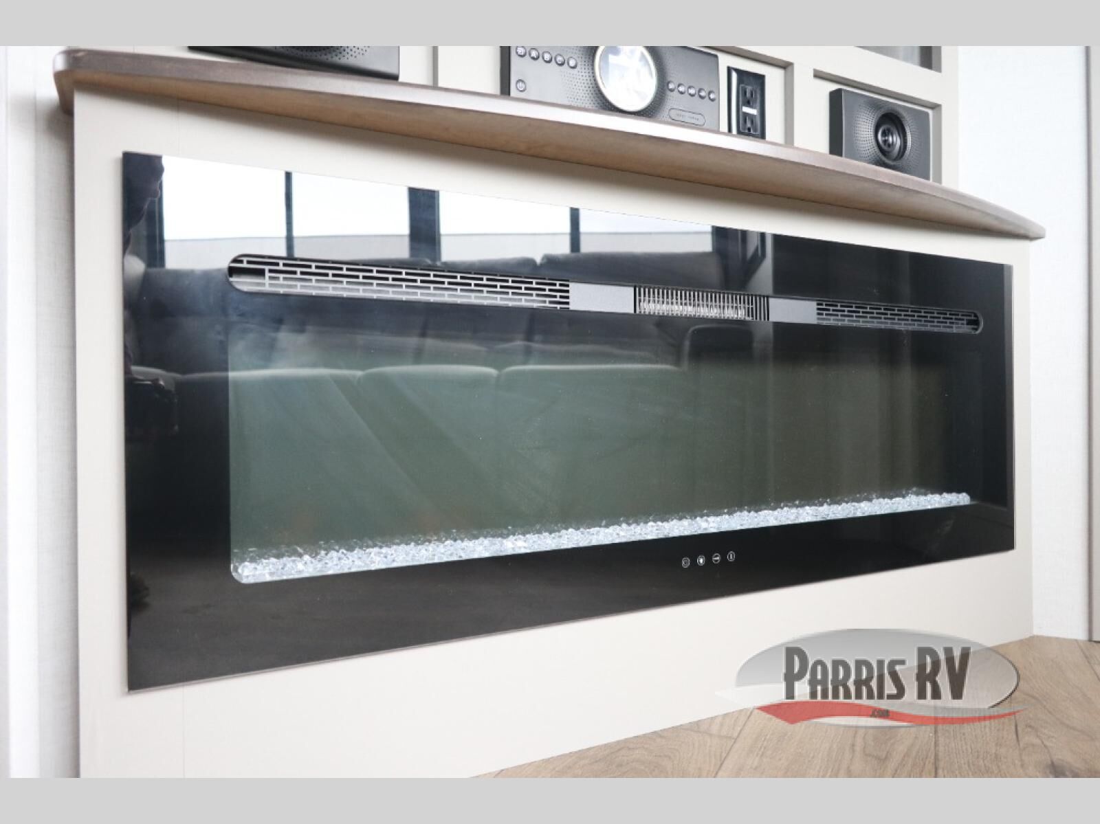 The whole gang will love camping in this toy hauler with a 14' garage for your toys and gear. Once you have arrived at your destination, you can set up the HappiJac roll-over sofas with a queen bed above them, and also a loft which opens to the garage area as well. A half bath is also available off the garage which is an added convenience for those sleeping in this converted area, and for those coming in off the trail so that they do not have to track all through the main unit to use the bathroom. The chef can prepare great meals for their hungry crew with the fully equipped kitchen including a four burner cooktop, a stainless steel 12V refrigerator, large sink, and plenty of countertop prep space. The rest of the gang can be relaxing on the large L-shaped sofa slide watching the 50" HDTV and enjoying the fireplace, or playing a game of cards at the dining table with four chairs. The front private bedroom features a king bed slide for more interior space, a flip top dresser for all of your belongings, and a front wardrobe with washer and dryer prep, plus it has an entrance into the dual entry bathroom!
