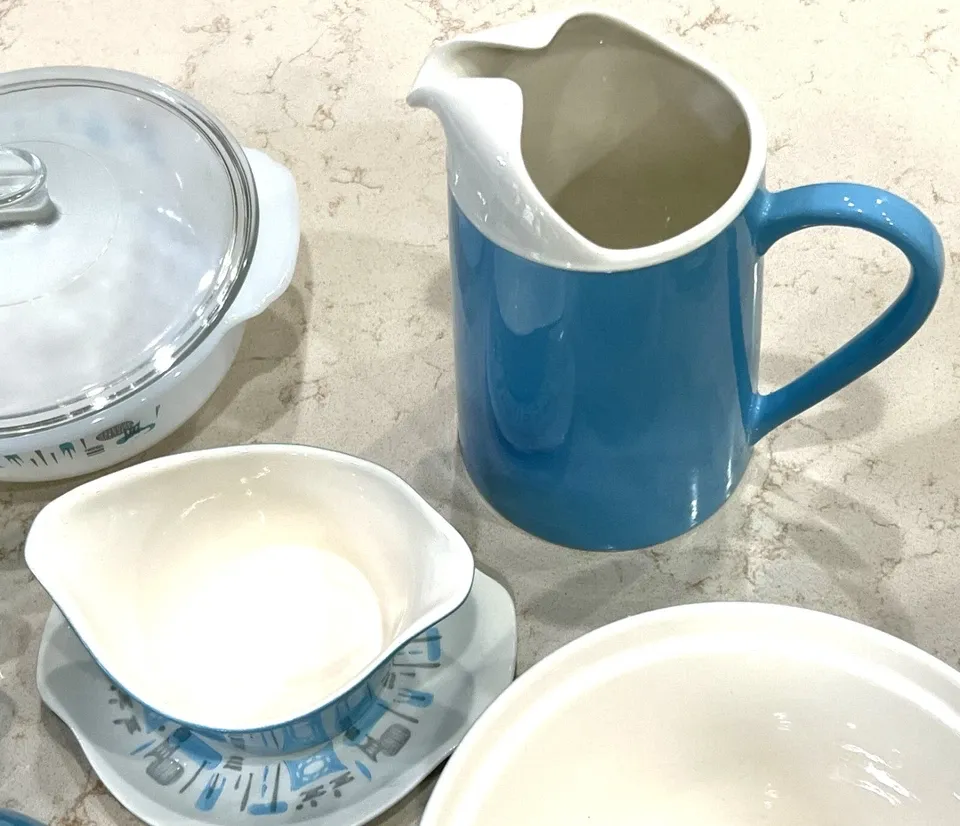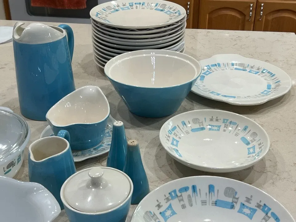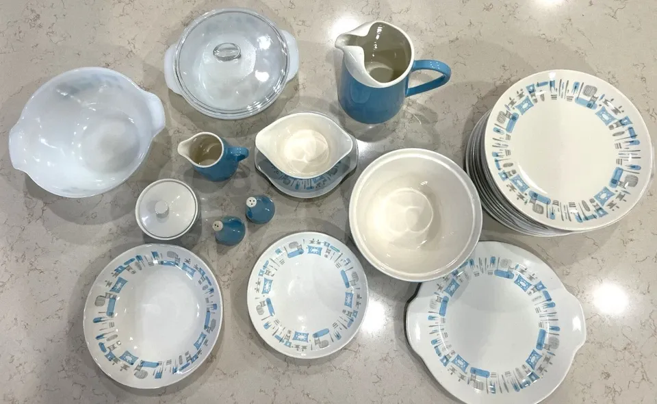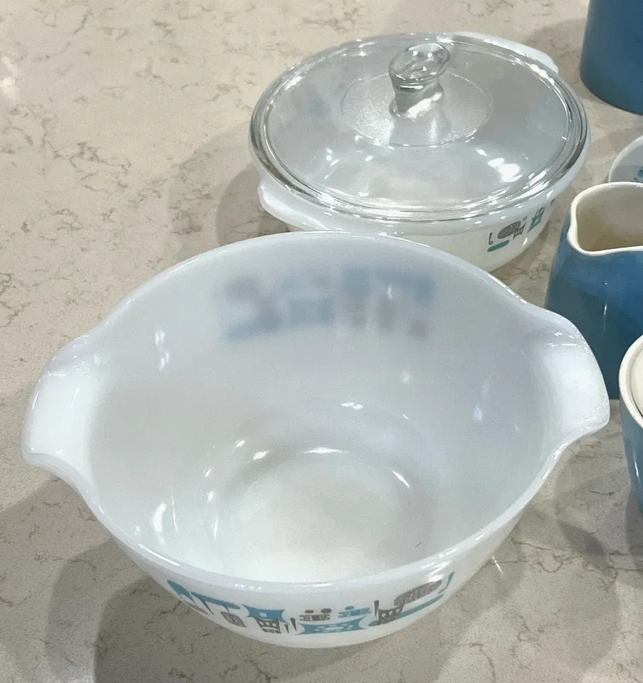 VenmoThis partial set includes some of the rarer finds in this pattern. Please see the vinatge promotional ad to get an idea of what other pieces need to be found to complete the set--if you have decided to collect an entire set. Since this pattern was so popular from the 1950s to the 1970s, I do not know when these specific pieces were manufactured. This listing is for the following pieces by Royal China (ceramic) or Fire King (glass):