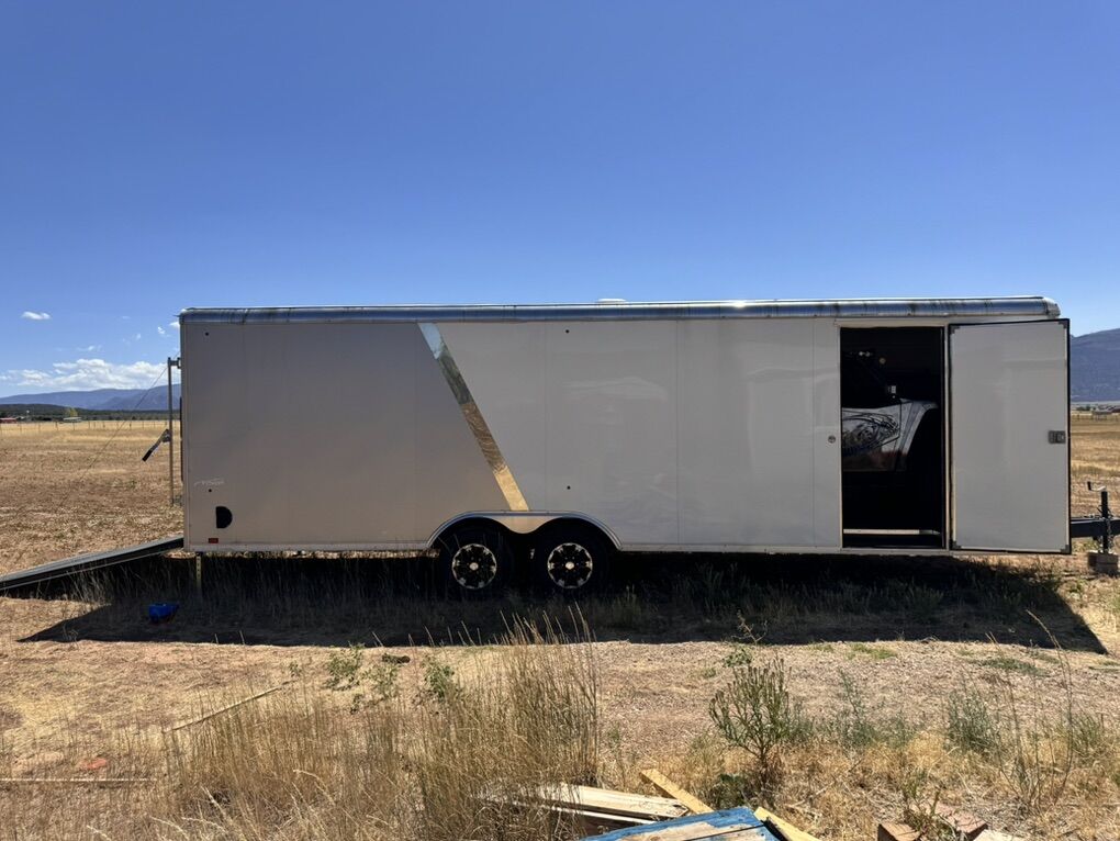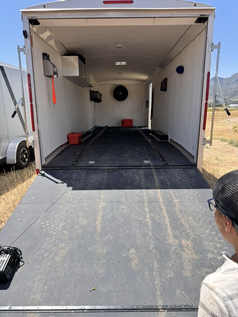 24 Ft Look Car Hauler tracks built in on floor, and aluminum diamond plate cabinets. Premium wheels fits both machines with ease. Side door, back ramp door . Call Michael (435) 531-1694 open to offers