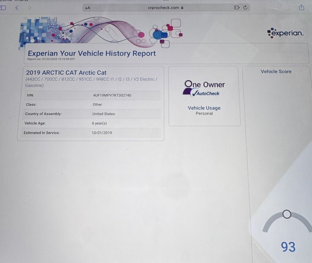 2019 articat wild cat 1000 SS Front & rear powder coated bumpers New wrap Winch & black grill with button in dash Powder coated front vents covers Full Light bar & 2 mini lights with switch Side mirrors Front & rear windshields Spare tire jack mounted on machine Antenna for push to talk Duel whips & Duel flags Custom exhaust system Adjustable fox shocks Overside 32”mud tires with black CX bead lock Manual windshield wiper INSIDE Custom PRP heated seats & harness with switches. PRP Side and back cargo bags Assault racing steering wheel Ratio with 2 speakers Trax Push to talk on dash. With head sets & walkie. Air pumper system with hoses for 2 helmets. 4x4 / lockers Rear view mirror 736 miles (Both come with a pro check report)