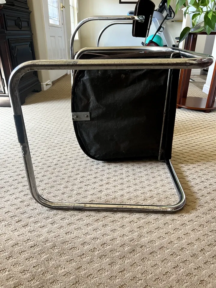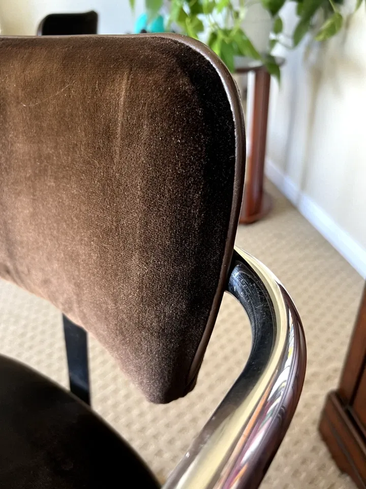 VenmoAuthentic 1930-1940's set of 2 tubular chrome arm chairs. Since there are no tags, I do not know the designer or manufacturer of these chairs. They look like chairs by KEM Weber or Gilbert Rohde. The brown velvet upholstery with leather/leatherette piping is original and in great condition for chairs this age.