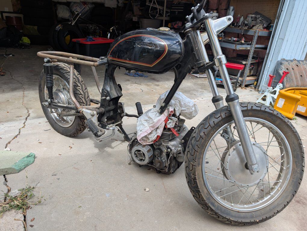 I hate to admit I'm never going to finish this project. My loss, your gain. All the stock parts are included. Title included. Was running when it was torn apart. The frame has been chopped right behind the tank mount. It includes 2 frame loops, but you'd need to find a seat you like and then weld the loop and shocks to match that geometry. The engine is torn down to rebuild the top end, all the component look good but I'd throw new rings and gaskets at it while it's torn down. Great for parts, or could be a cool project.