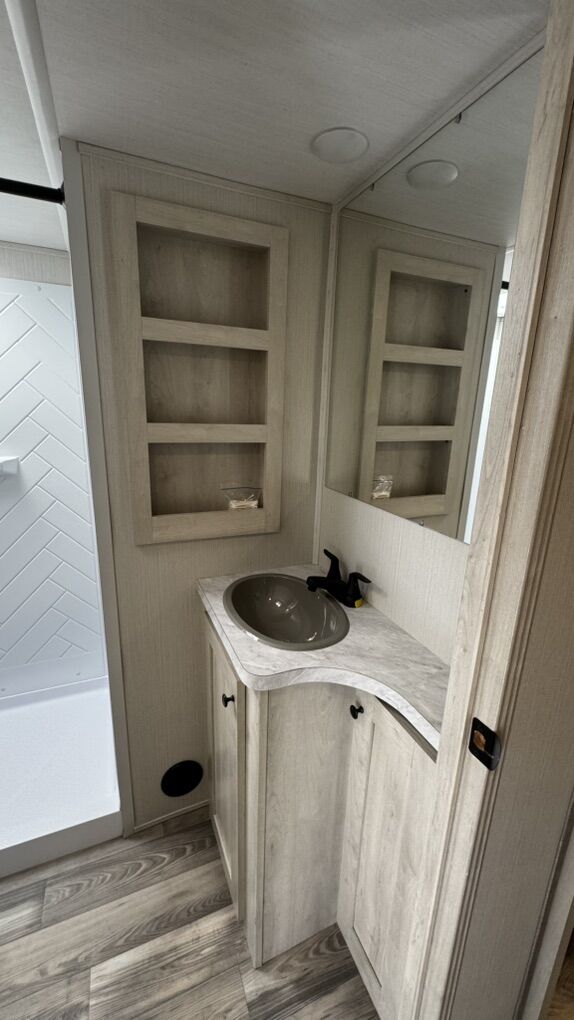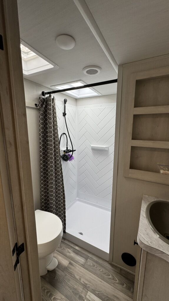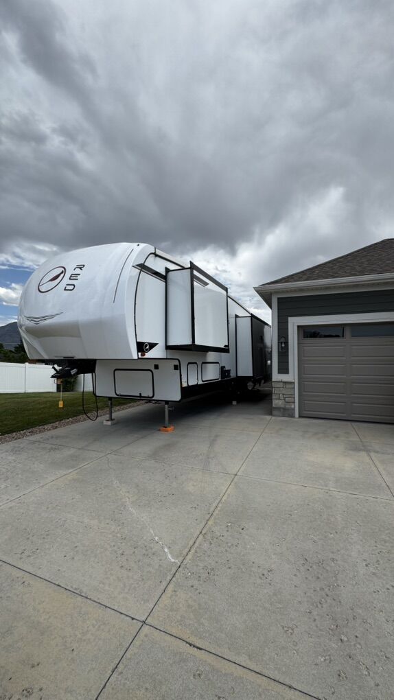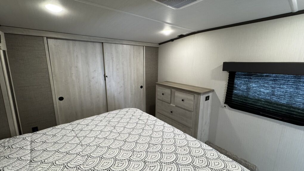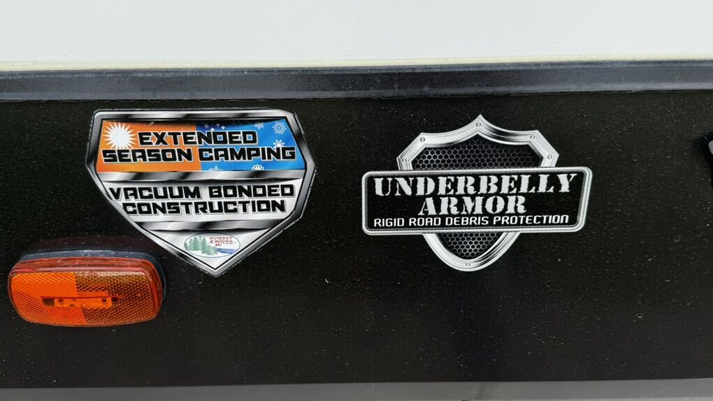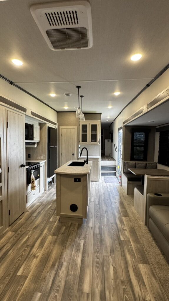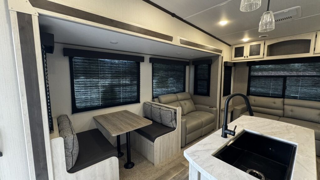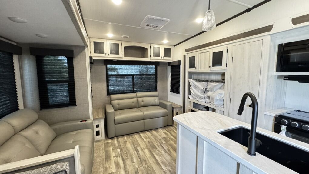 • Rear-living layout with panoramic windows • Dual recliners, electric fireplace & 50” smart TV • Kitchen island, solid-surface countertops, black appliances • Electric water heater for fast, reliable hot water • King-sized bed with underbed storage • Washer/dryer prep, large wardrobe, overhead cabinetry • Power awning with LED lighting • Enclosed underbelly & climate control system • Transferable extended warranty covering key systems