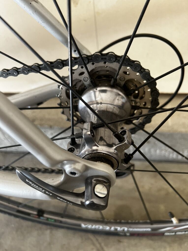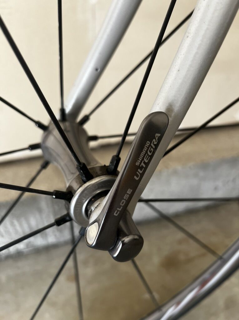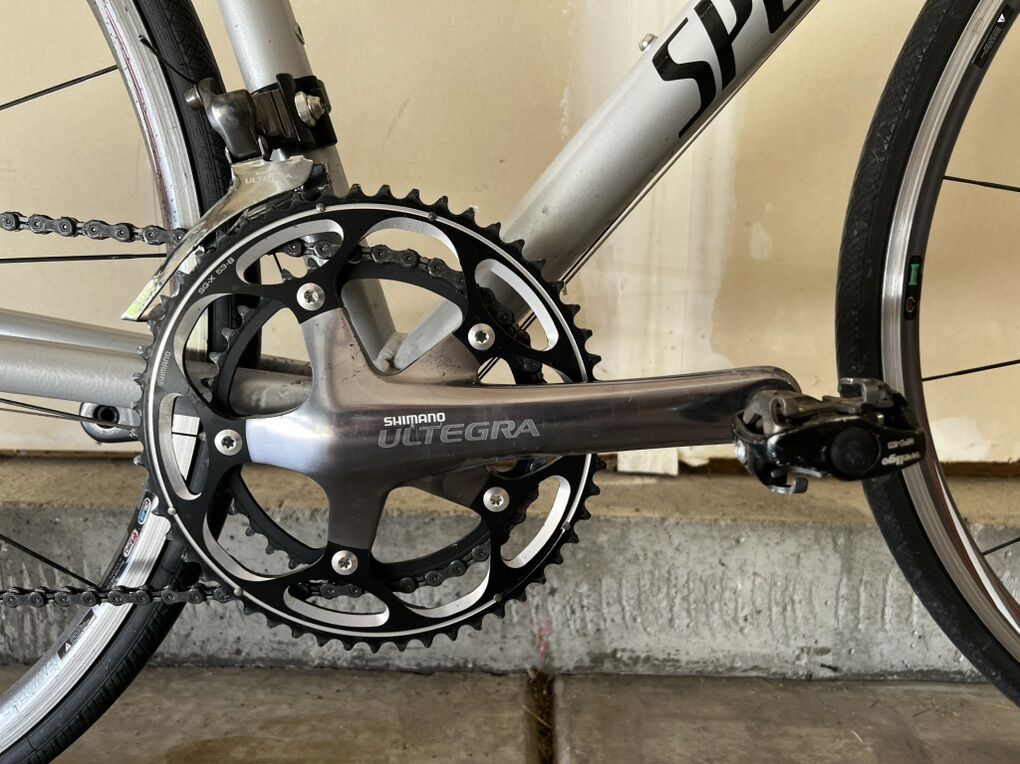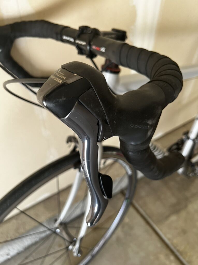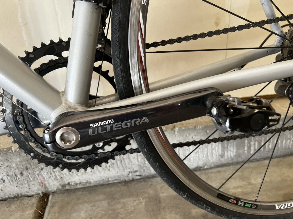 Upgraded road bike with refinished frame and fork. Frame: 56cm Frame material: Aluminum Ultegra group set: Crank, hubs, deraileur, brakes and shifters, wheels-rims