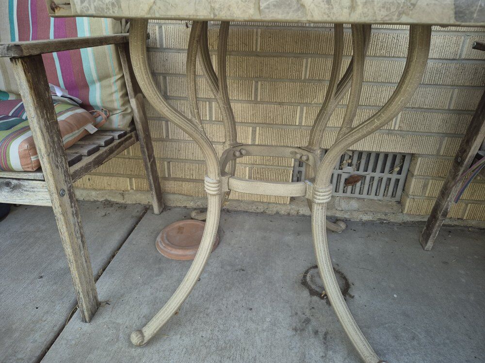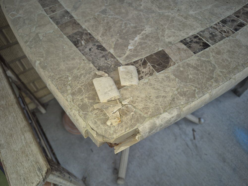marble patio table metal stone some pieces are coming of one of the corners as shown in pictures. table top is 2x2 feet approximately