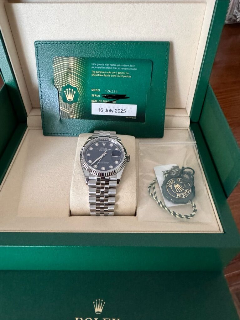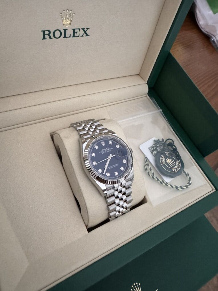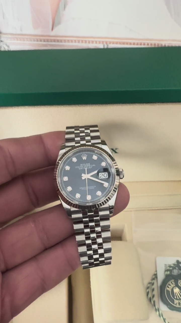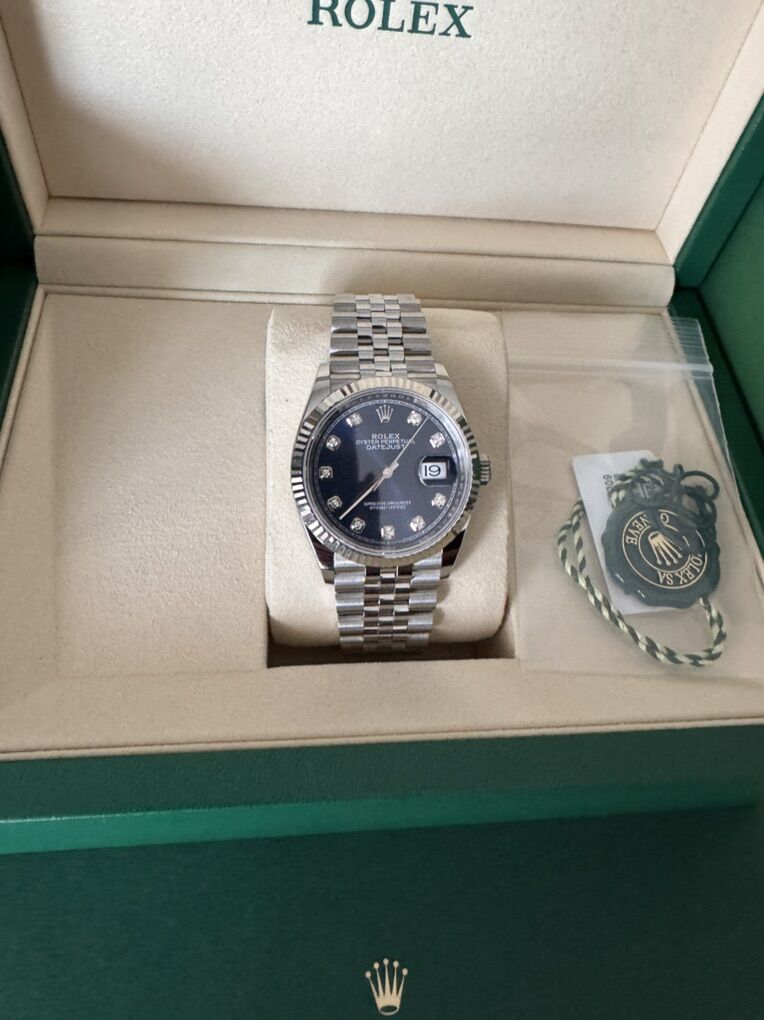 Rolex datejust 36 mm fluted bezel! rare blue face with diamond markers never worn ever sized comes complete with box and paperwork