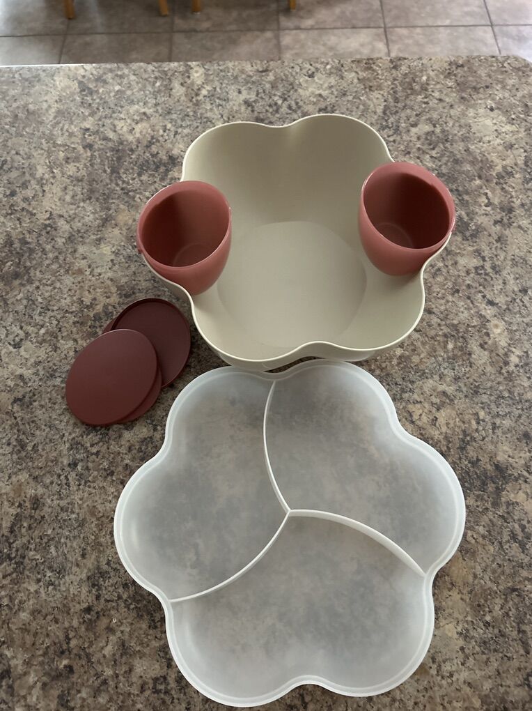 VenmoTUPPERWARE Chip And Dip set. Great for Salads, chips and dips, veggie tray and dips, Punch Bowl. These dip bowls have hooks and attach to the sides of the bowl. Tupperware’s Open House Collection. No Longer Available from Tupperware in this Color: Latte & Cinnamon. Sells for $54, asking $20 Pick up in Woods Cross
