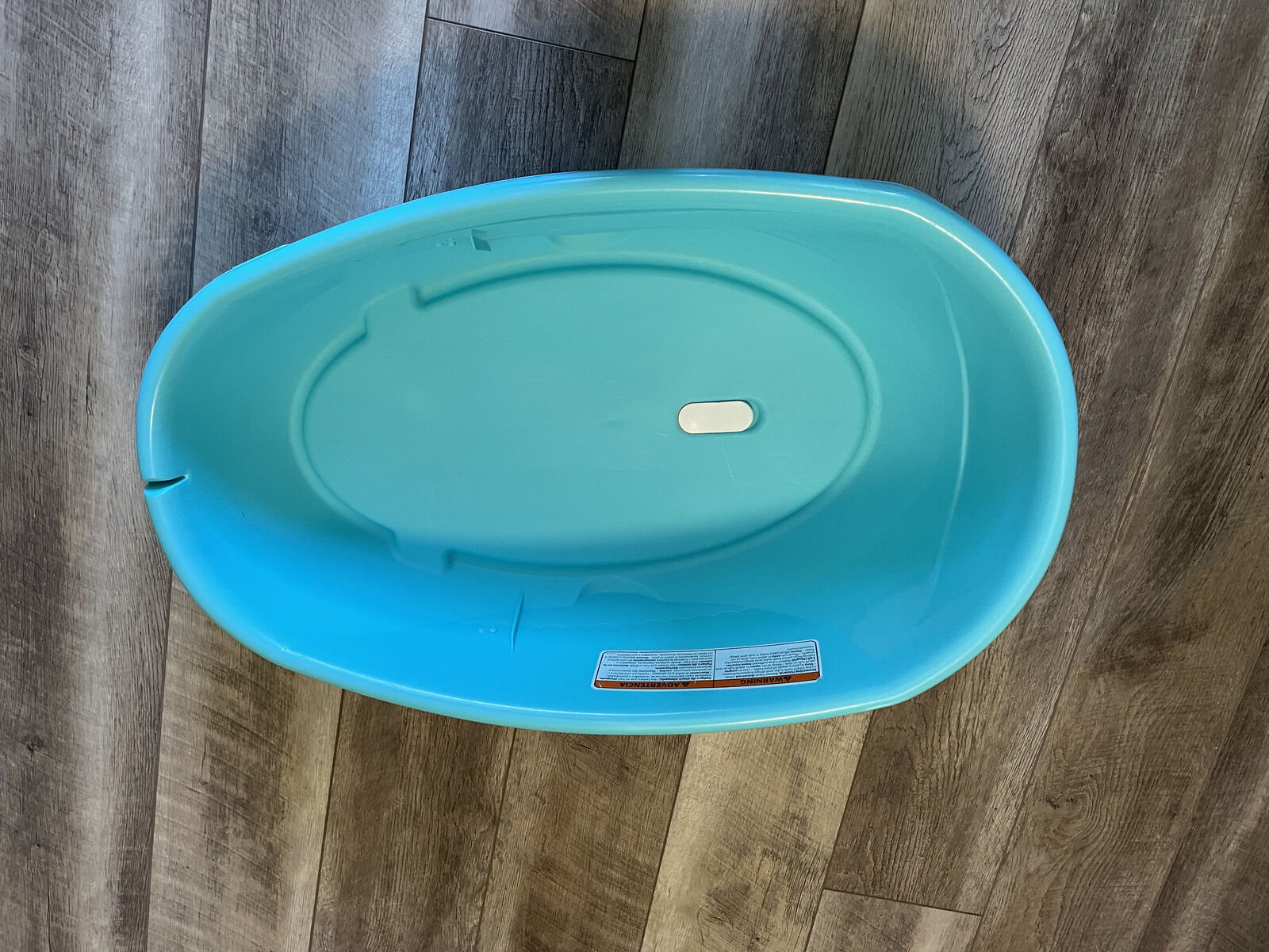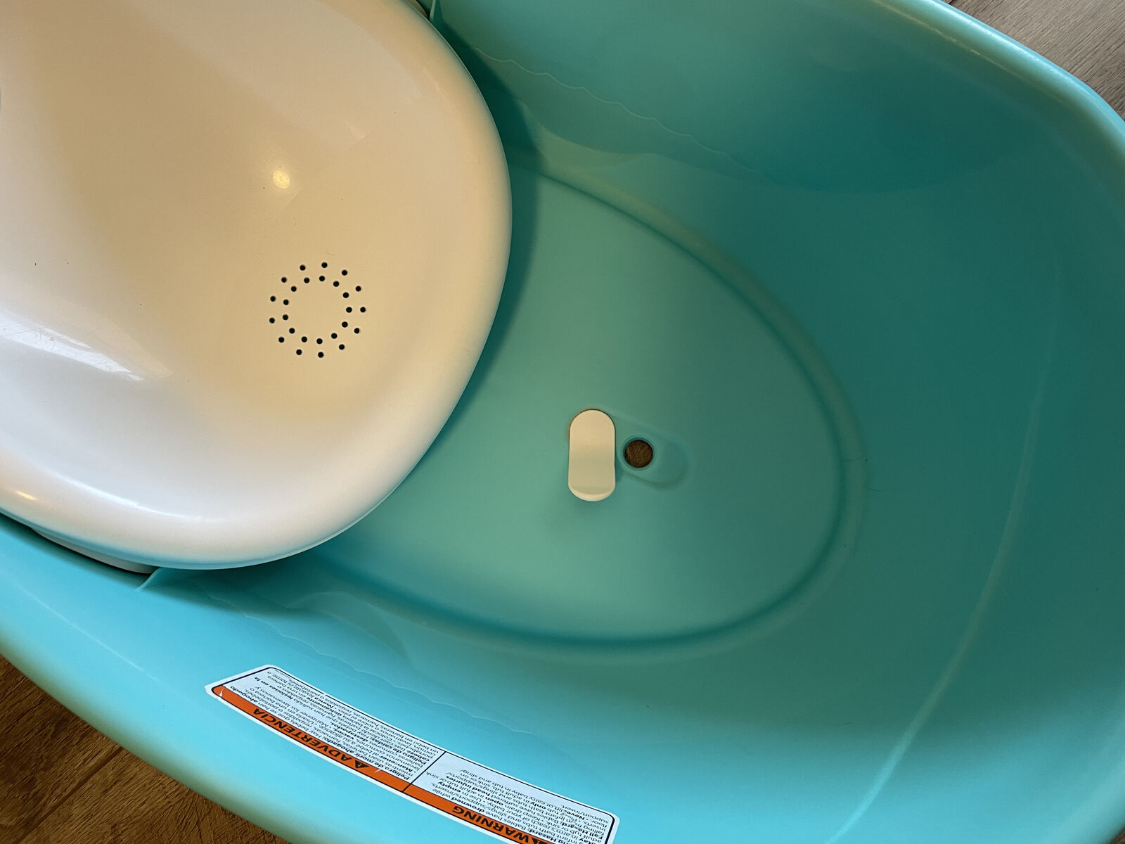 About this item Contoured infant seat with cozy padded seat back helps keep baby from slipping and sliding Remove baby seat to add even more room on the non-slip surface for toddler bathing Innovative flush drain plug makes baby more comfortable and cleanup simple and fast Fits in the tub or most sinks Product Care Instructions: Wipe with Damp Cloth Product Dimensions: 28.5L x 17.3W x 9.3H