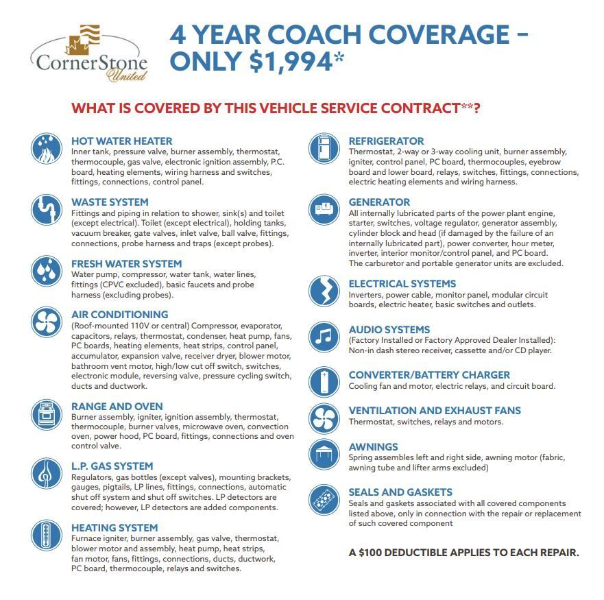 Extended Service Contracts are available with purchase. You can add 100,000 additional miles of powertrain coverage or 4 years of coverage for the appliances and systems of the coach. They have a simple $100 deductible and can be used virtually anywhere. Contracts are both transferable and can be canceled any time for a refund.