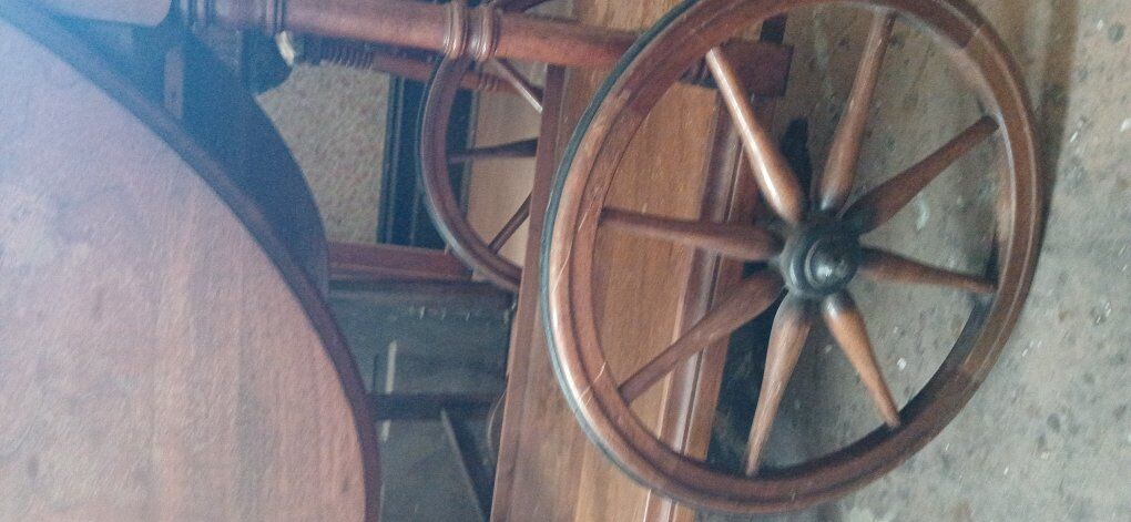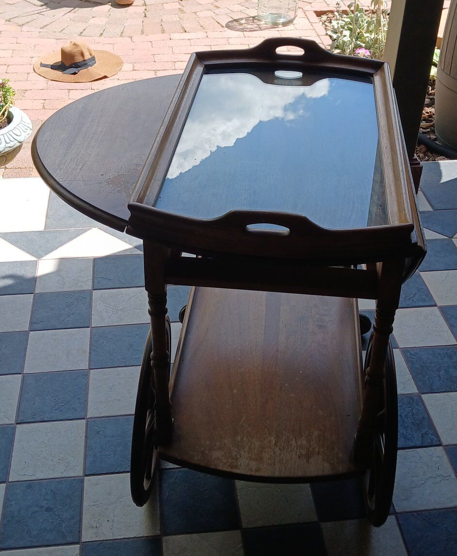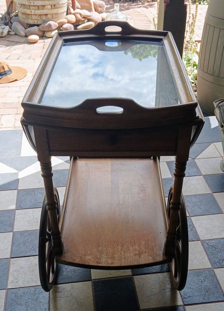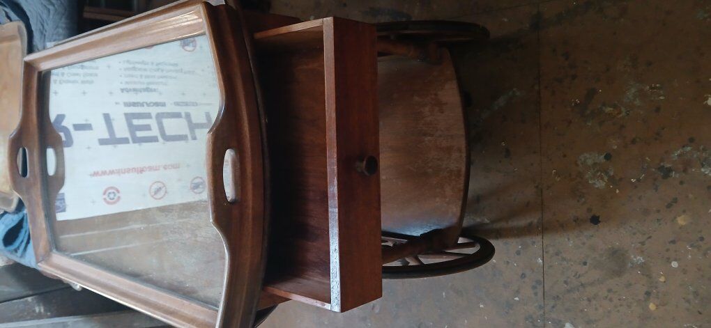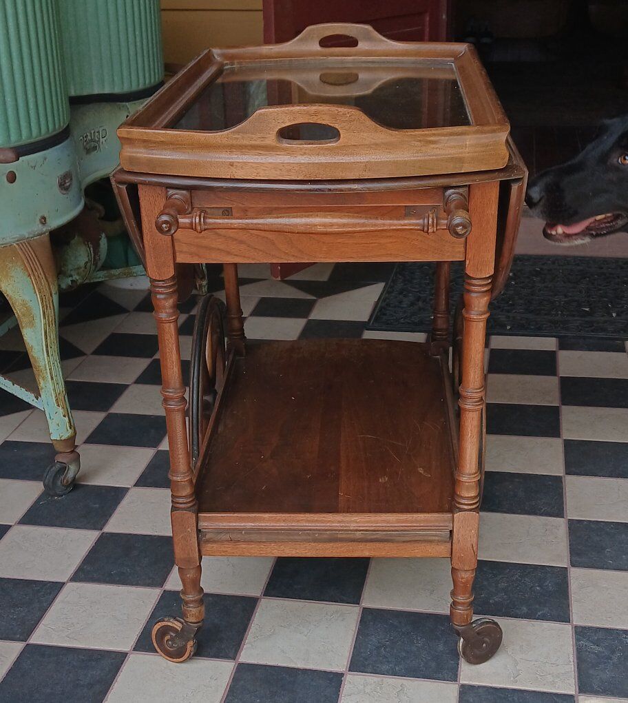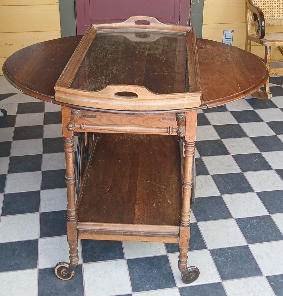 Walnut tea cart with original glass serving tray. Drawer on one end and handle/tea towel rack on the other end. Drawer and all wood is solid walnut, no secondary wood or veneers. Leaf hardware patent date 1883. (142 y.o.) Leaf hardware and wheels in good working condition. Finish on the lower shelf and top is not great, needs some oil, wax or stain. The rest looks in good condition. Quality piece. OBO to intetested party.