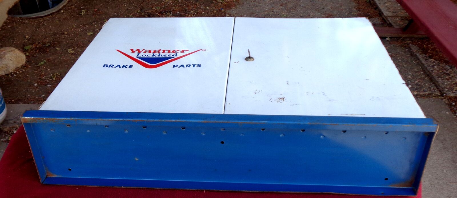 The Vintage Wagner Lockheed Brake Parts Dealer Wall Cabinet is a unique collector's item that offers a piece of automotive history. Made in the United States, this cabinet includes a key for added convenience. With a universal fitment and vintage appeal, this item is perfect for those who appreciate classic car parts and accessories. the authenticity and charm of this rare find. don't let it slip away.