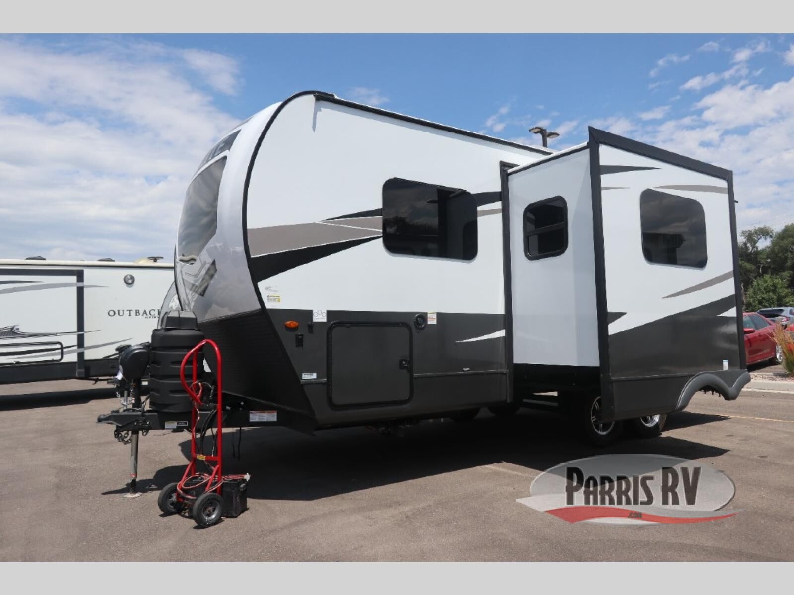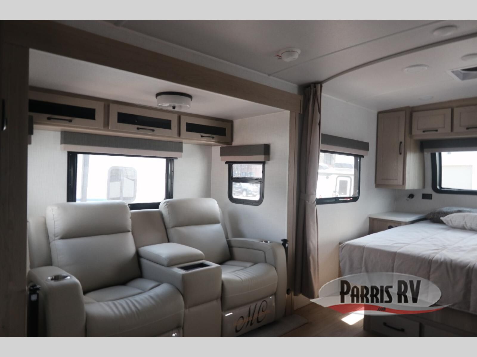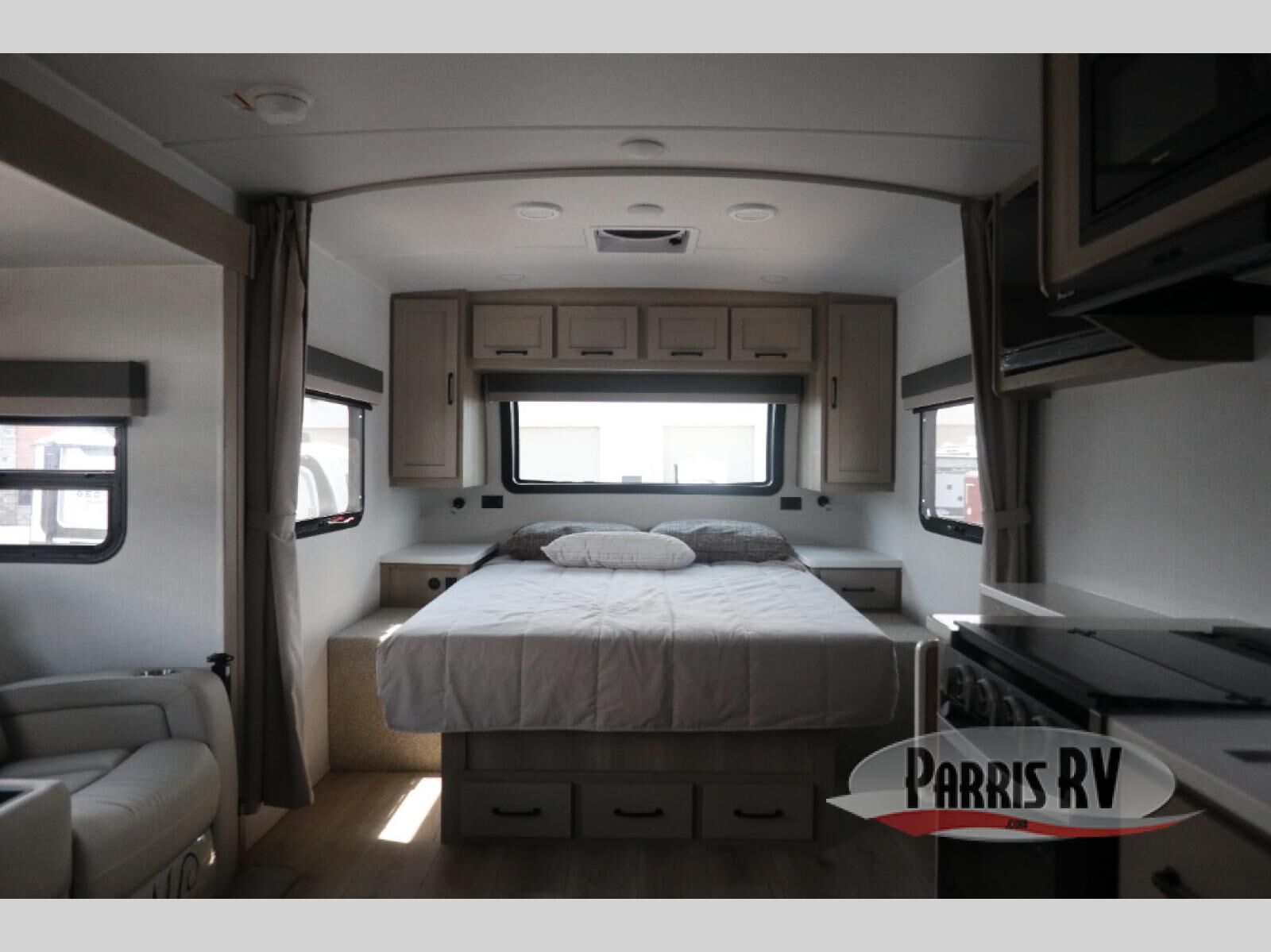 Enjoy the camping season with your spouse, friend, or significant other in this cozy travel trailer for two. Each morning, you can have your coffee on the 67" theater seats with a table within the slide out, then head outdoors to make pancakes on the outdoor griddle with an LP hookup. The interior kitchen includes a three burner cooktop, a microwave oven, plus a 12 volt refrigerator for perishables. An entertainment center with a fireplace will make your space feel more like home, and what's better than sleeping on your own queen bed with dual bedroom wardrobes for your clothes!?