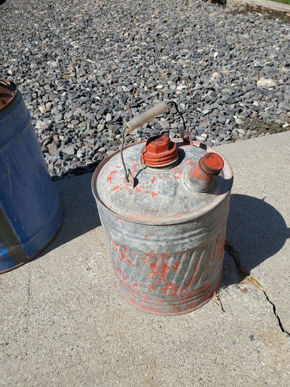 Several vintage gas cans and oil cans.