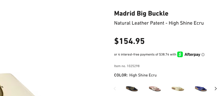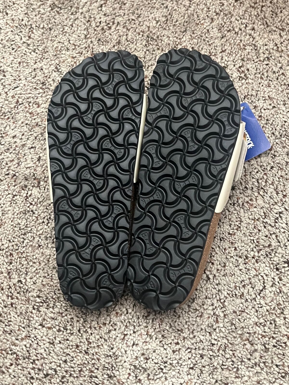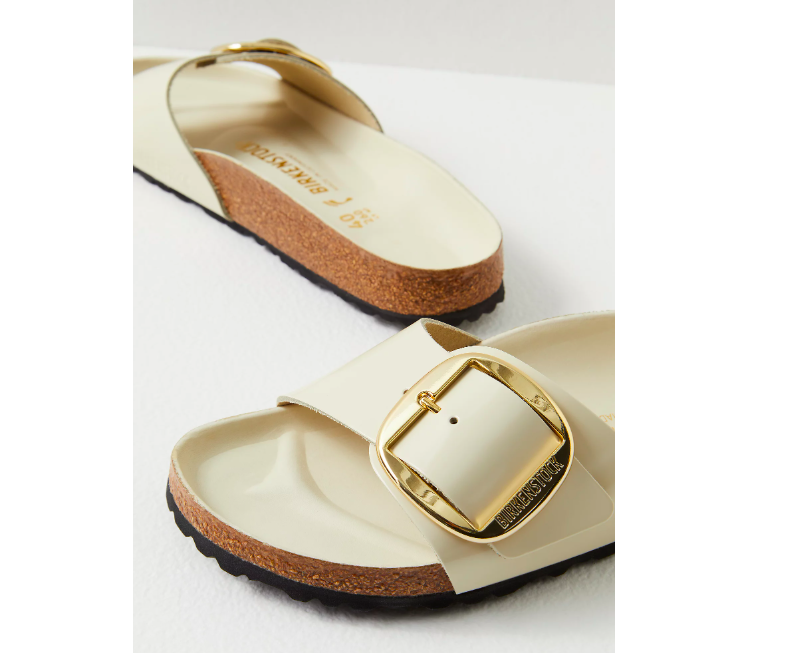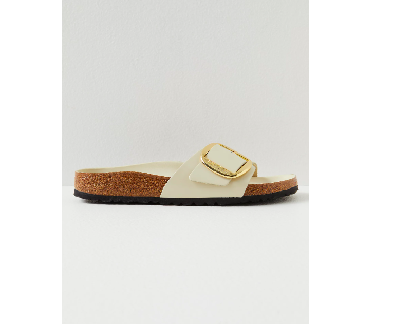 Brand New Women's Birkenstock Madrid Big Buckle Natural Leather Patent - High Shine Ecru (Size 37)- New Without Box Contoured cork-latex footbed creates custom support with wear Natural leather upper with high-shine finish Footbed lined in smooth leather for a luxe touch Flexible EVA sole Adjustable strap with oversized metal pin buckle Made in Germany