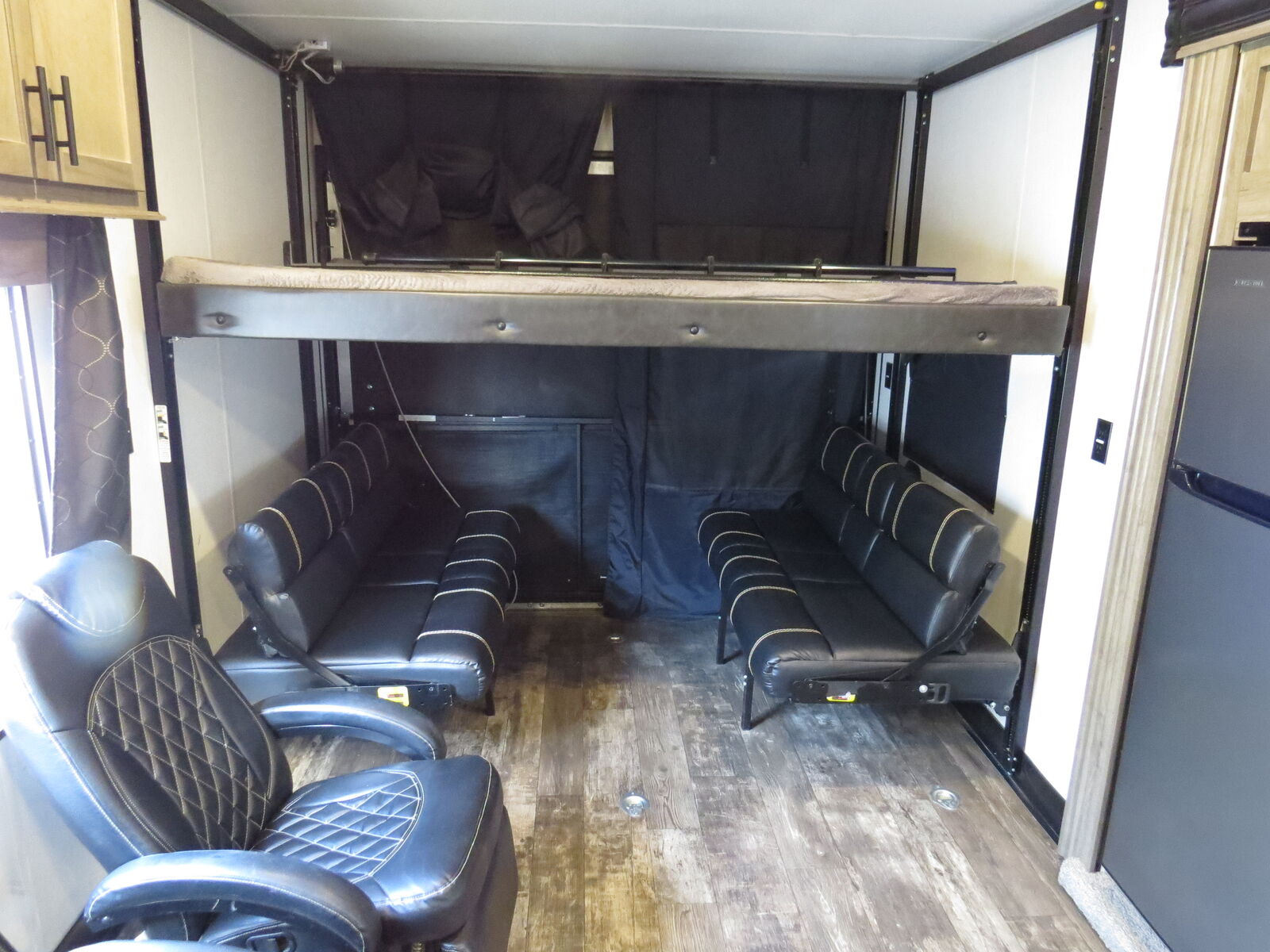 1 Slide! 15' Garage Space!, SOLAR!, Walk around Queen bed, Kitchen Slide, Yamaha 4000 Watt Generator, Double Electric rear Beds with bottom bed makes into Booth Dinette, Big bathroom, Kitchen, Electric patio awning, Fiberglass exterior, A/C unit and Heat. Location: 50 S Frontage Rd, Springville Dealer#832B Quality RV -Financing Available-