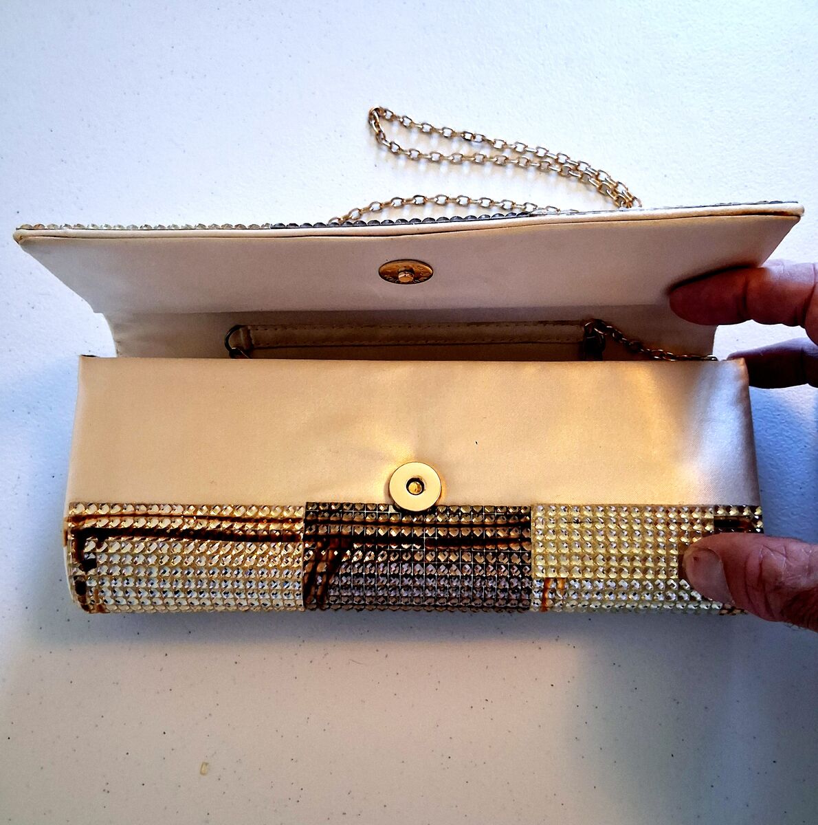 ZelleOne of a kind tri-color clutch with unique design. Can be used with or without short, gold chain. Cream satin interior. Length: 9.5" Width: 4" Depth: 2" Used once.