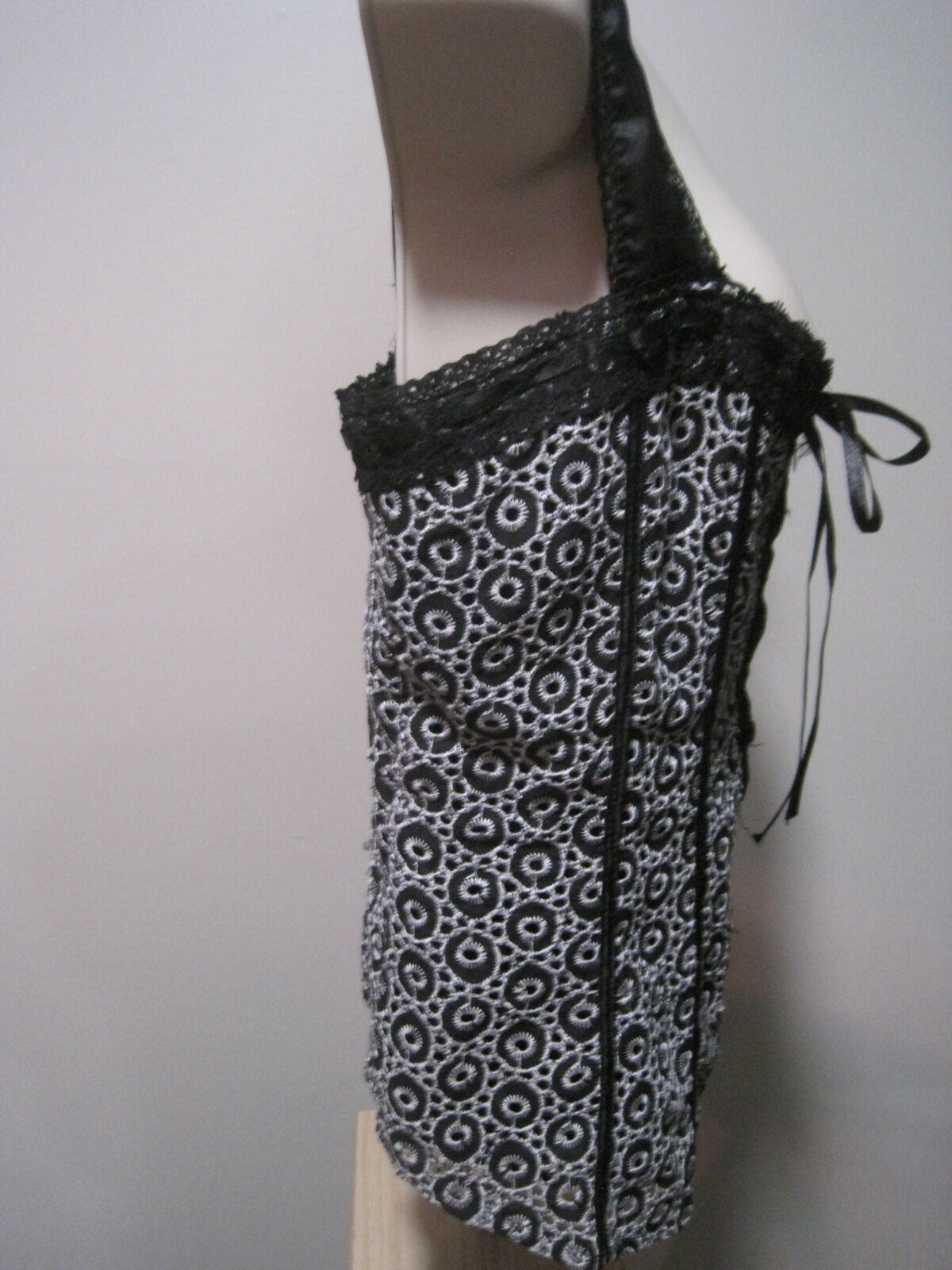 This Bebe Vintage Women's Small Black and White Circle Lace Button Blouse is a stylish and versatile piece perfect for various occasions. The geometric pattern, sleeveless design, and button closure add a touch of sophistication to the blouse. Made by bebe, this vintage top has a regular fit and collarless feature, making it a chic choice for summer outings, parties, or casual wear. The multicolor design adds a fun pop to any outfit, making it a must-have addition to any woman's wardrobe.
