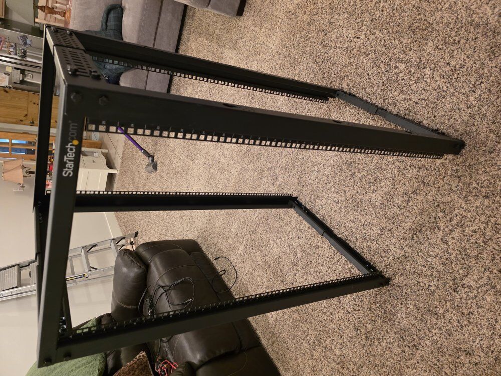 Venmo25U Adjustable 4 post Open Frame Rack. Not new, but never used. I bought it over a year ago. Finally got around to this project and it doesn't quite fit where I want it to go. Missing one bottom crossbar. It still works great but you have nothing to attach the casters to. Permanent location These go for over $300 new so my mistake is your gain.