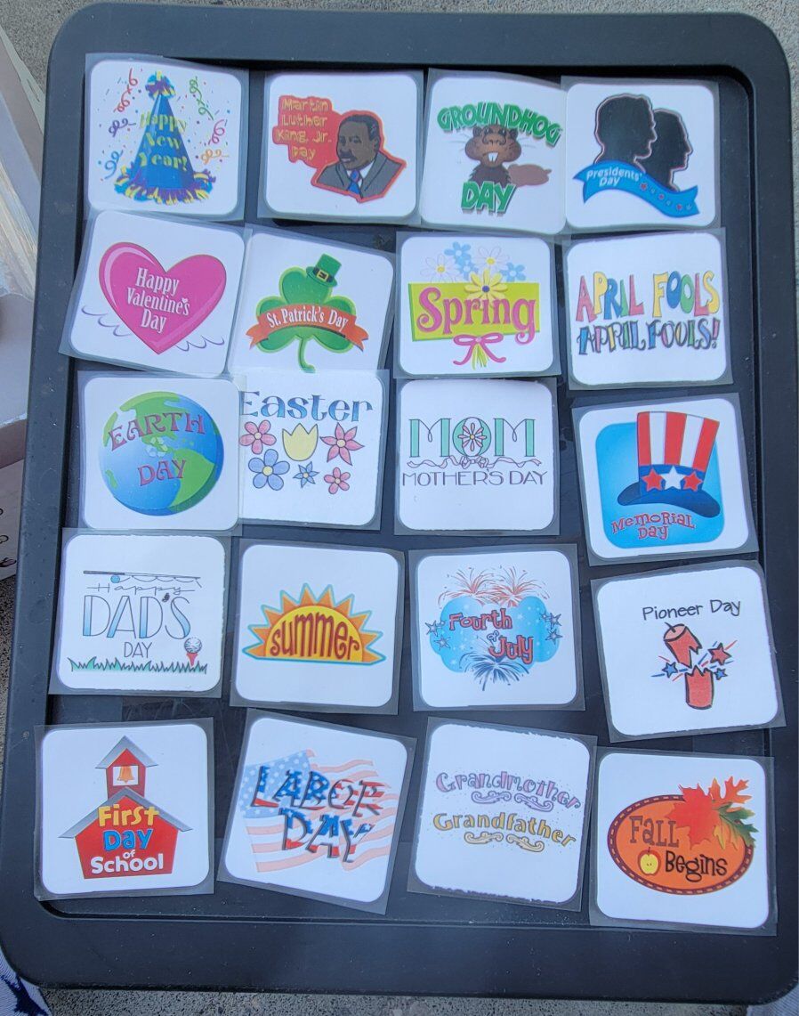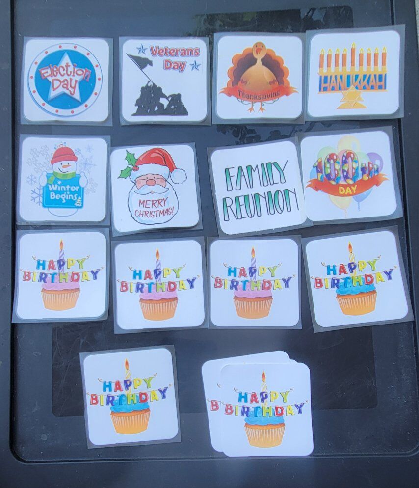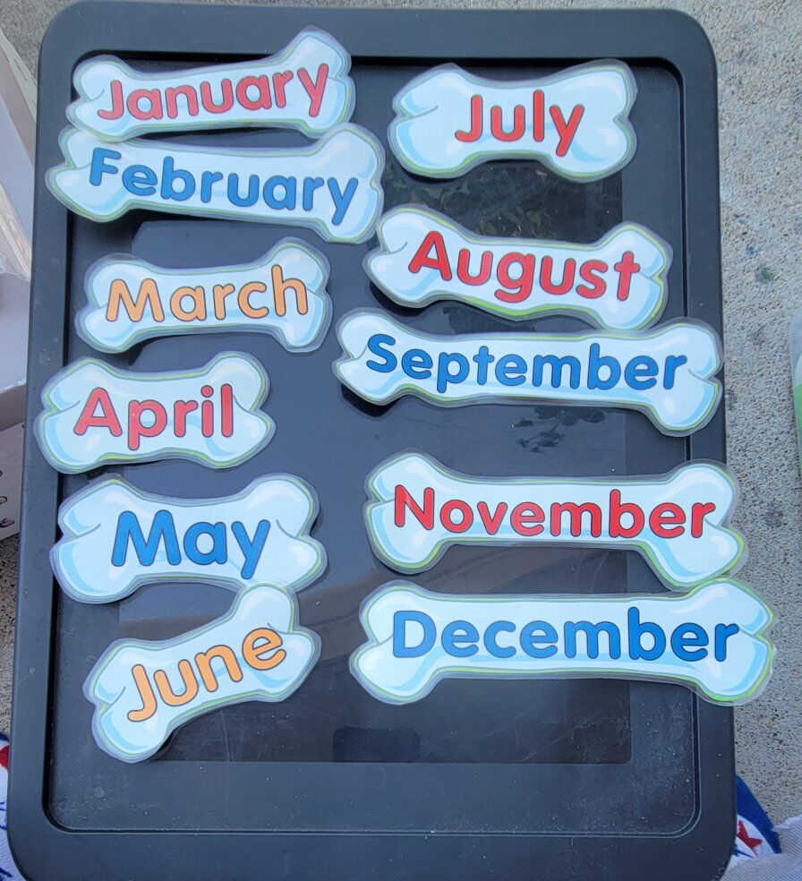 Venmo$5, includes large laminated calendar grid that hangs by grommets, month dog bones, numbers 1-31, many holiday squares. All attach with velcro.