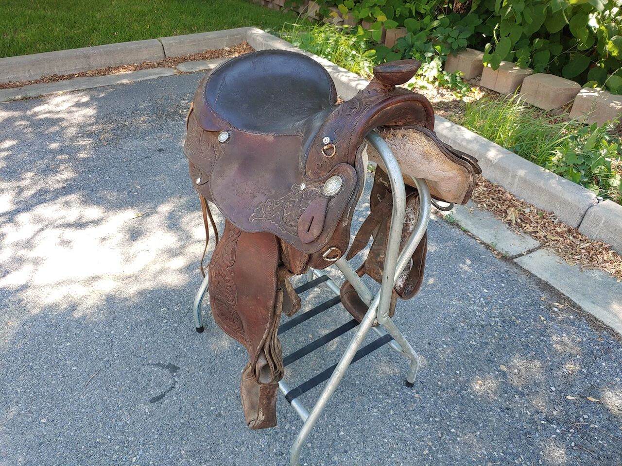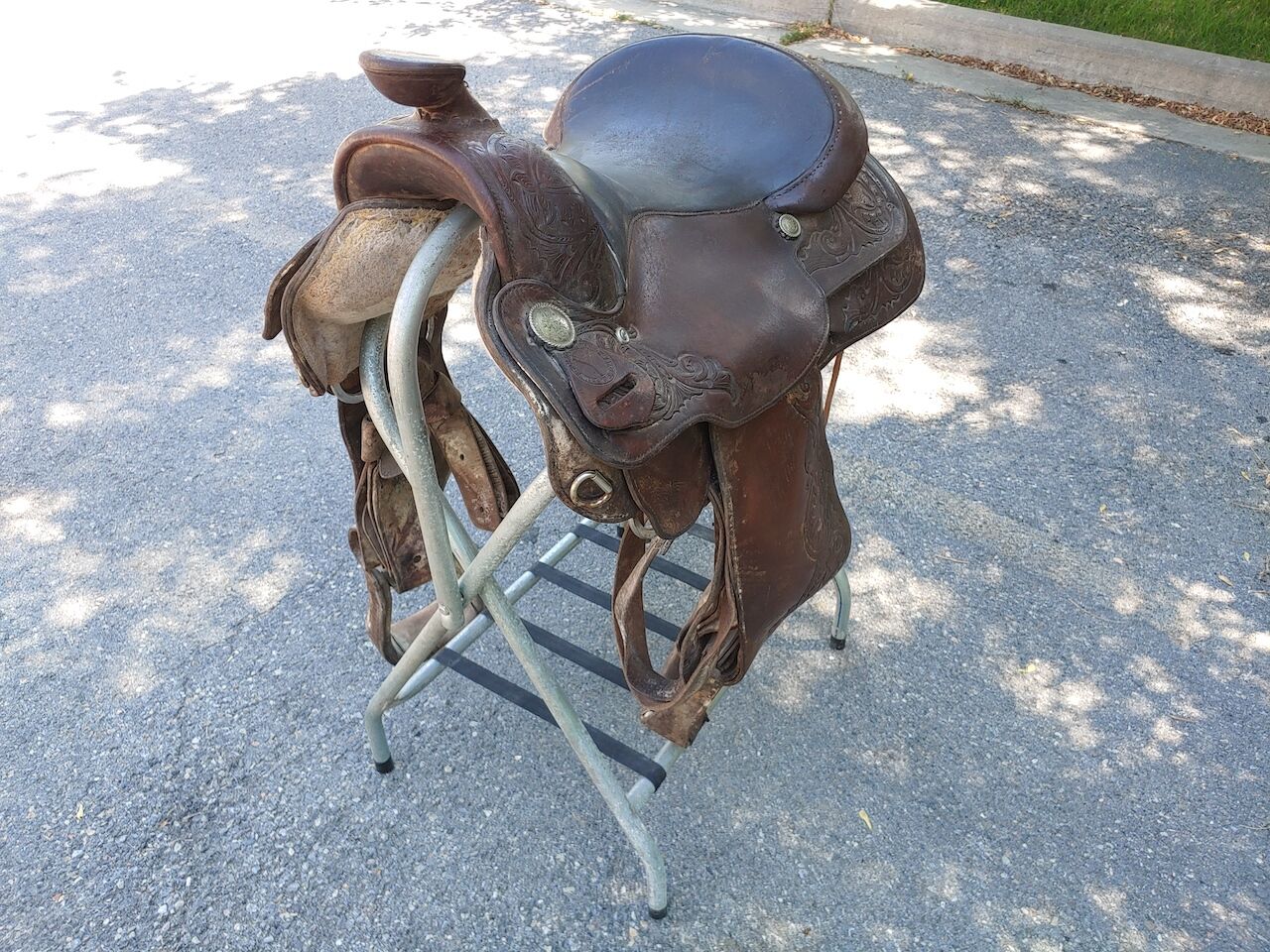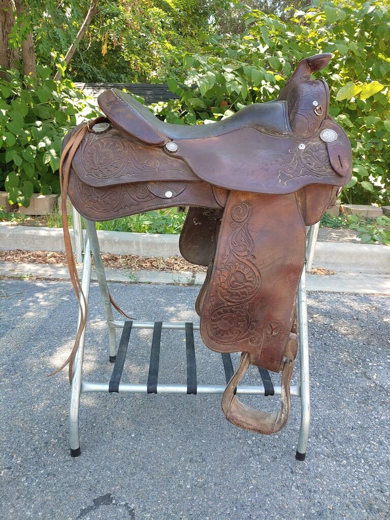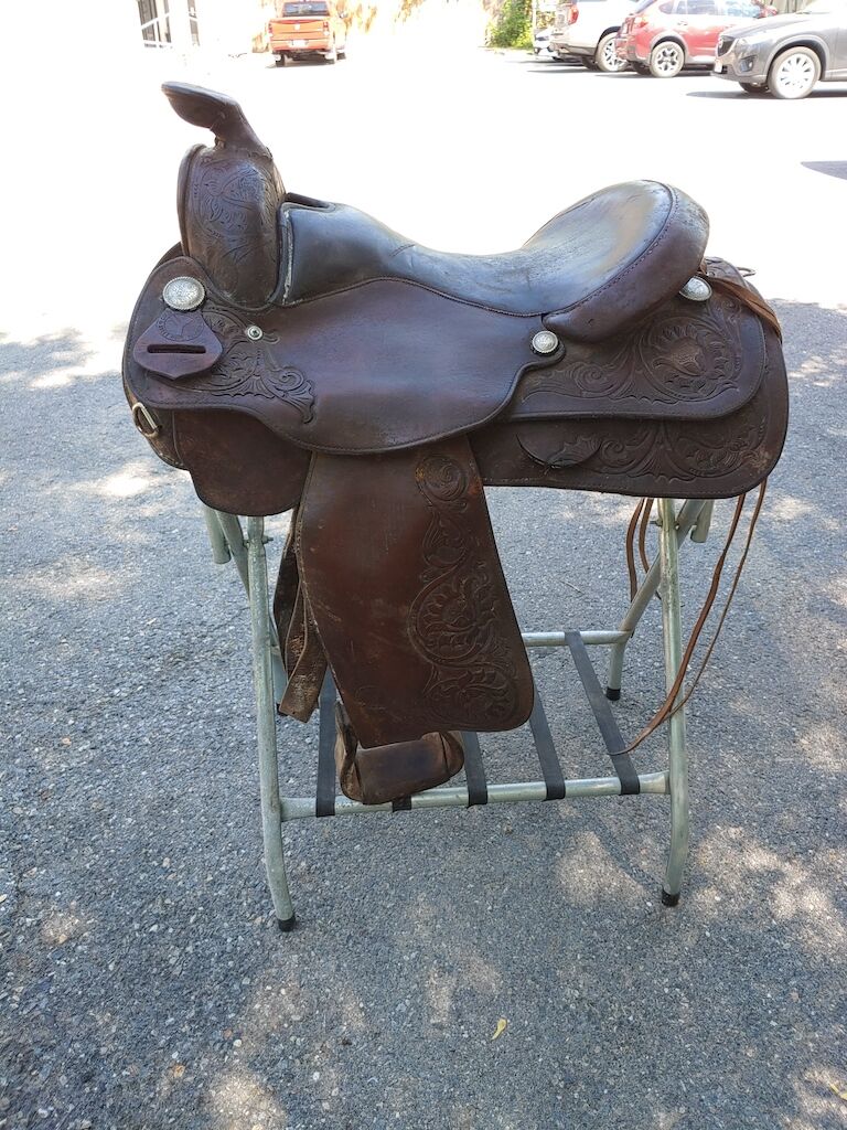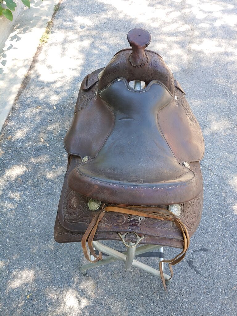 This saddle has been stored in my Father-in-Laws tack barn for a good 25 years. It was purchased in 1990 and used for about a decade. He absolutely loved this saddle and it would be great to see it go to a good home. Needs a super deep cleaning and probably several coats of Neem Oil but once restored would be a fine saddle to spend the day in. Asking $550.00