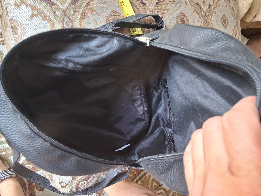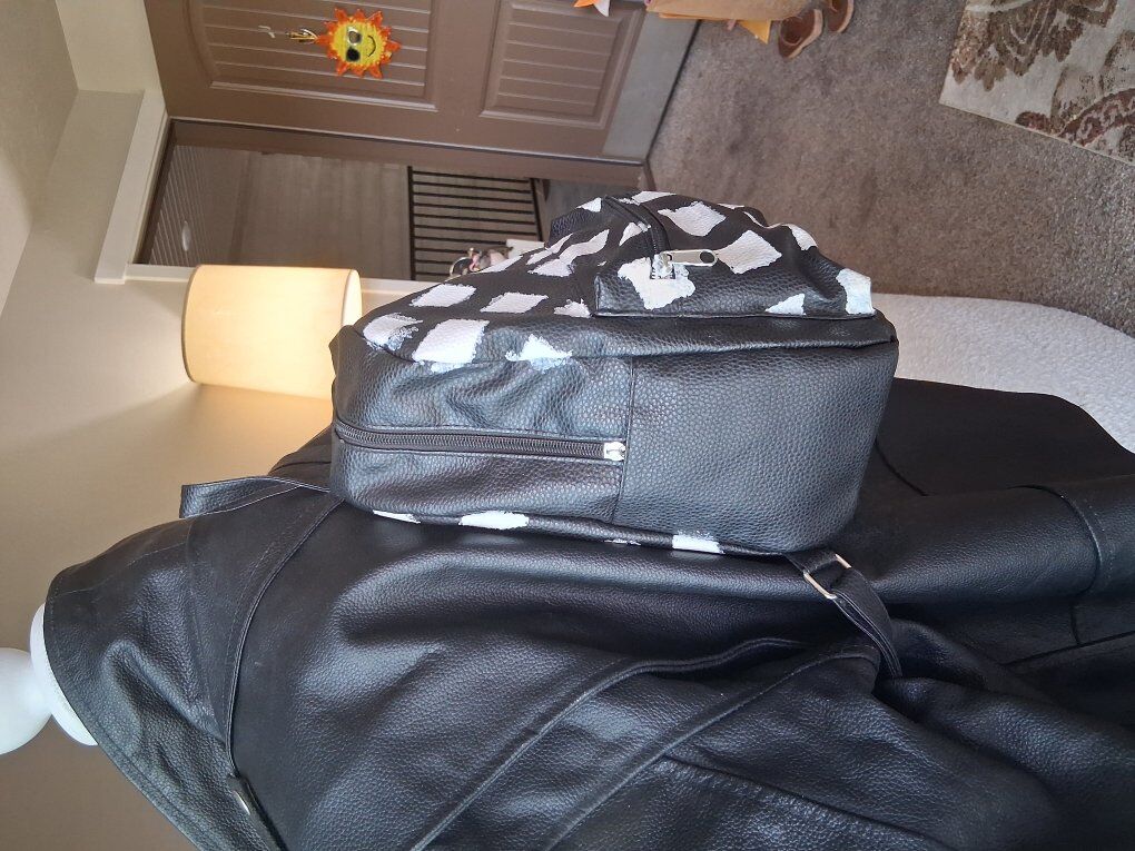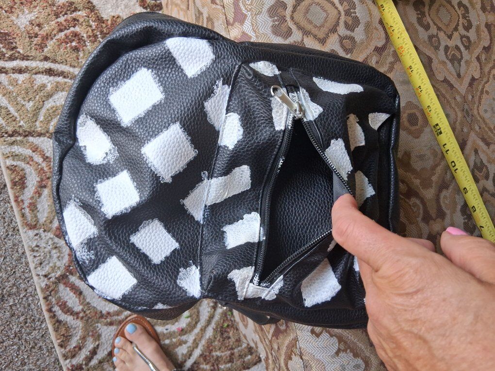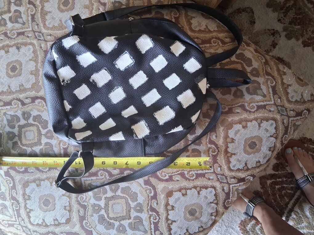Adjustable straps, zip closure. Silver hardware, front zip pocket.