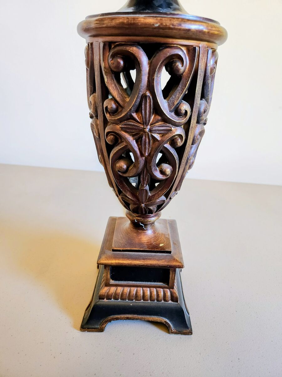 ZelleThe lamp features a classic design with a beige, bell-shaped fabric shade that has a slight gradient and a gold-colored finial on top. The shade has brown trim along top and bottom edges. The base is an ornate dark colored stand with intricate detailing and a slender, curved stem. Measures 29" from base to light bulb; Shade is 9"; Base is 6x6". The style is "vintage" or "antique" There is a small tear inside the shape near the top that is NOT VISIBLE from the outside.