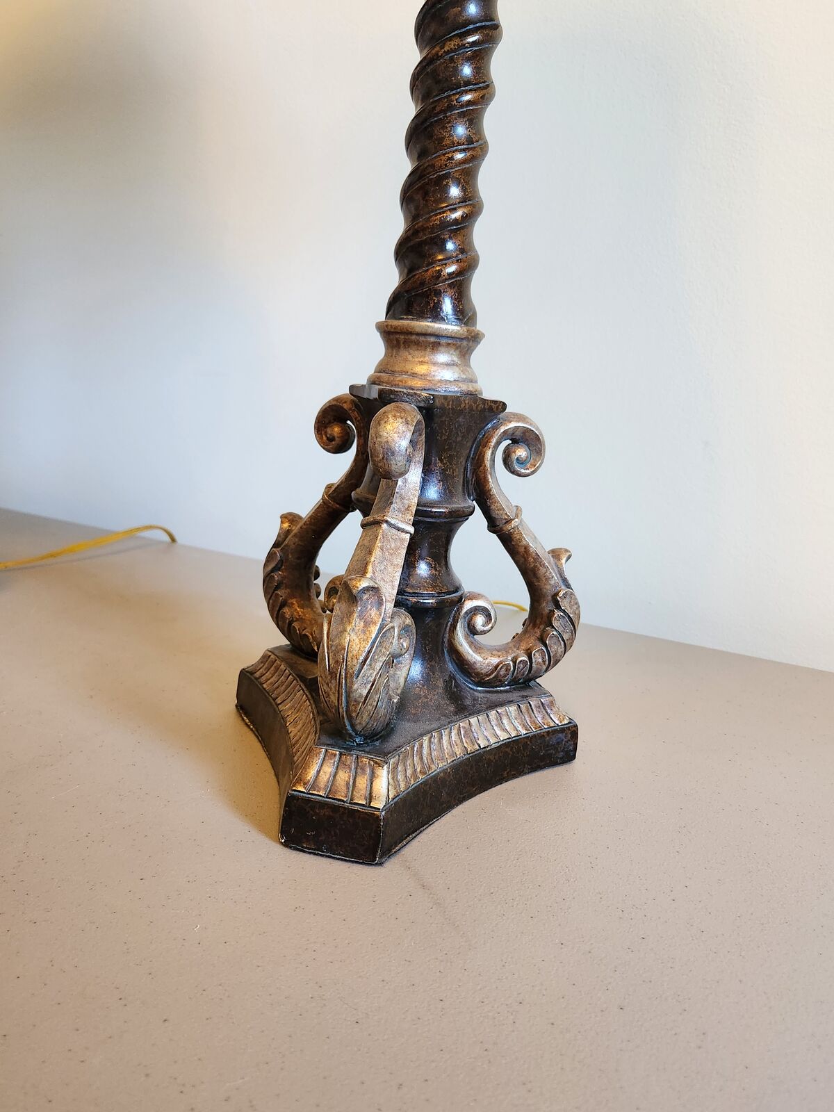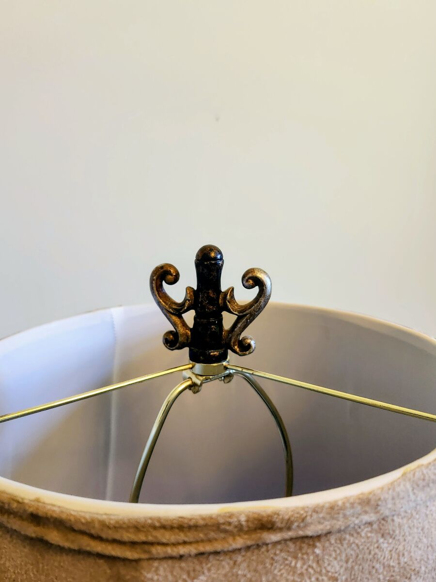 ZelleDark metallic finish takes on a bronze/gold shimmer. Intricately crafted, showcasing a decorative metalwork look. Curved lines and ornate design gives a vintage or traditional vibe. Base to lightbulb is 25". Rare taupe, bell-shaped SUEDE SHADES are 12". The suede fabric is durable yet soft. $50 for the pair