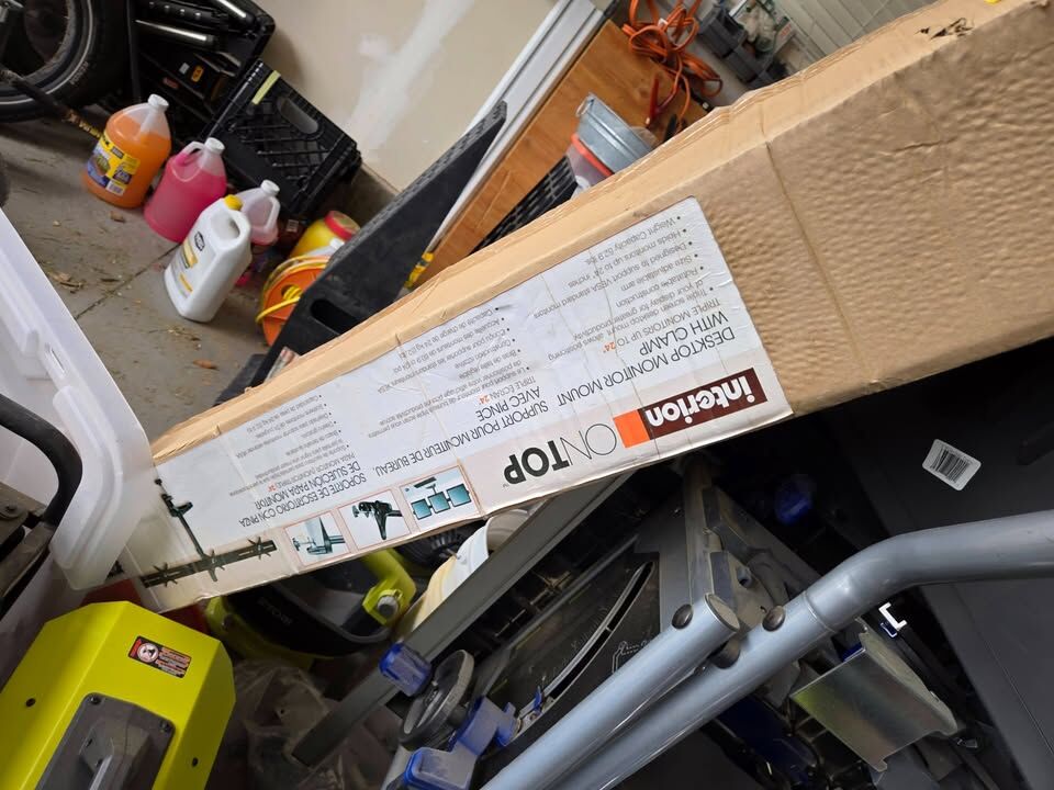 New in box. I have a similar one that doesn't have the clamp and it fit my 3 x 24" monitors.